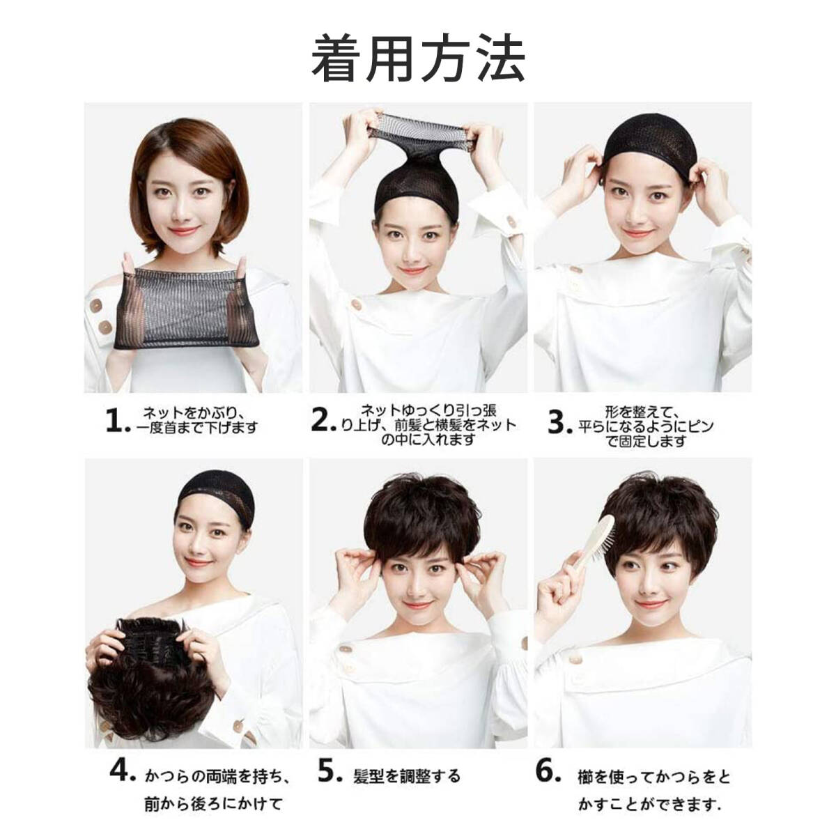着用手順 | 1、ウィッグネットを両手で頭のてっぺんから下に被ります 2、ウィッグネットを頭に合わせ、ネットに髪を入れ、もみあげや後部の髪が漏れないように注意してください 3、ウィッグネットに髪をまんべんなく入れ、開口部分を折り曲げてクリップで留める 4、ウィッグをよく手入れし、もみあげと耳部位をつまんでウィッグを頭にかぶせます。 |