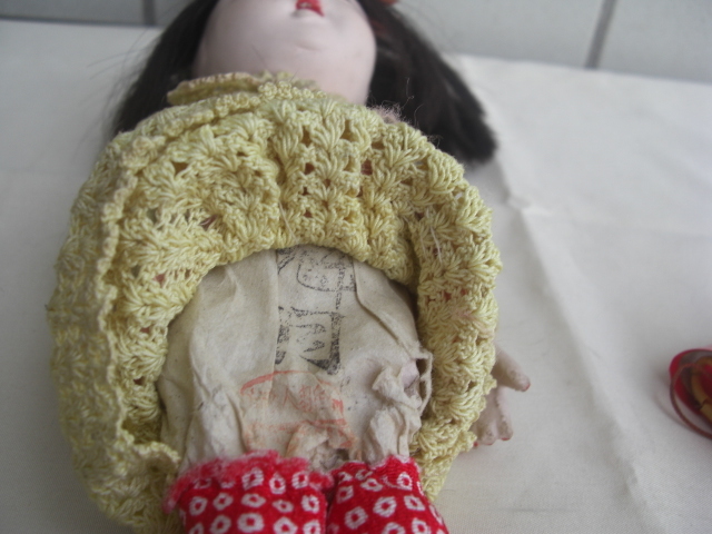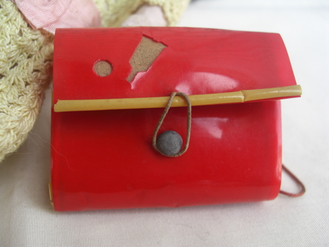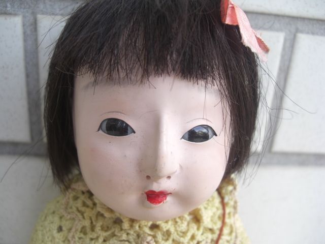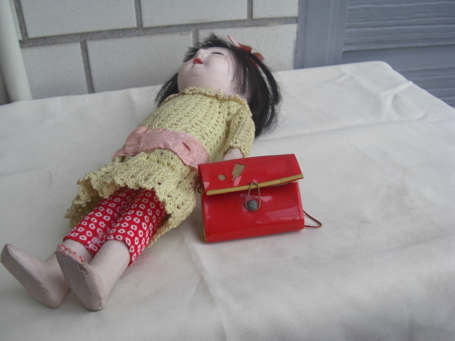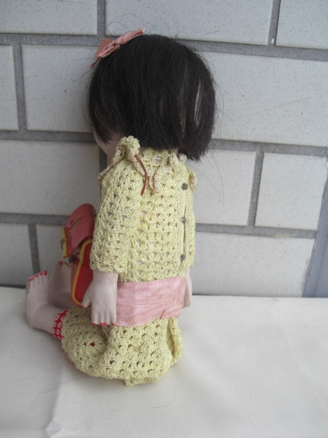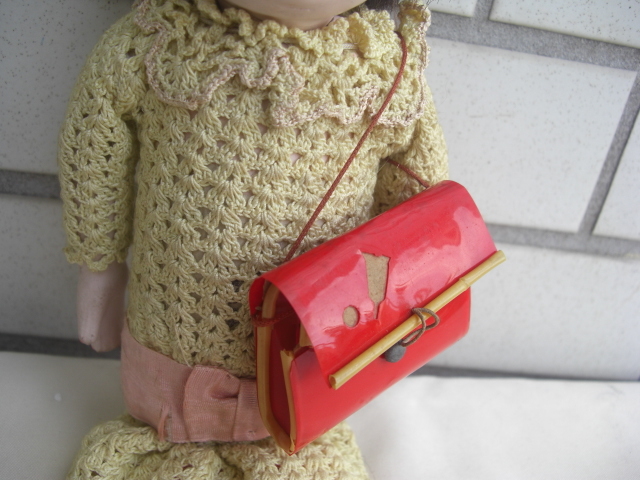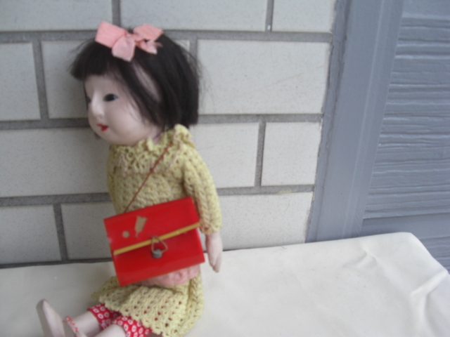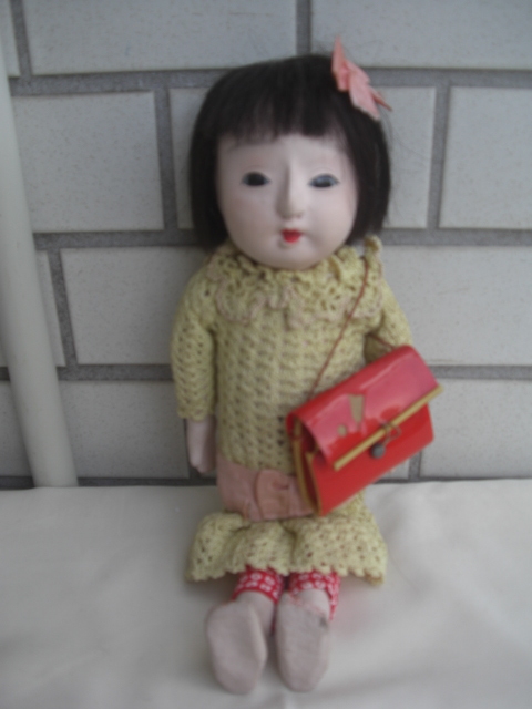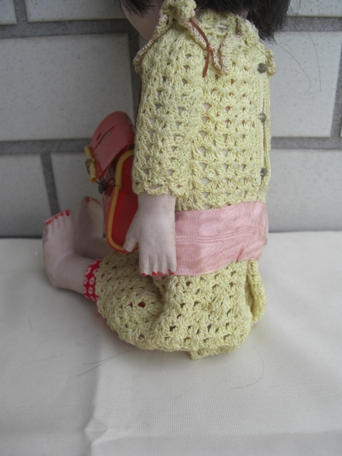 サイズ 身長28cm 大正ごろの古い市松人形です。手編みのレースを着て可愛いバックを持っています。何分古い物なので全体に汚れあり・・。かわいがっていただける方是非。
