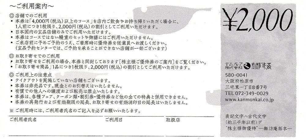 出 品 商 品 | 株式会社 関門海 株主優待 8000円分(2000円券×4枚) |
