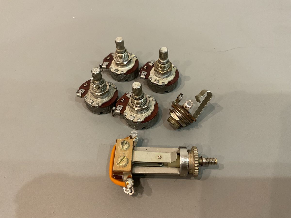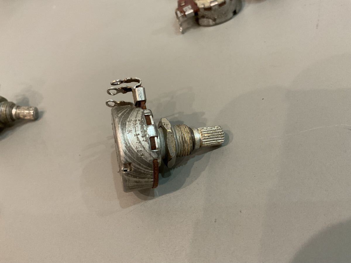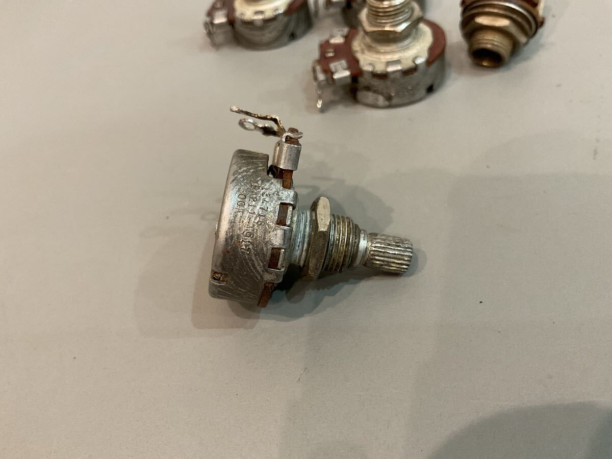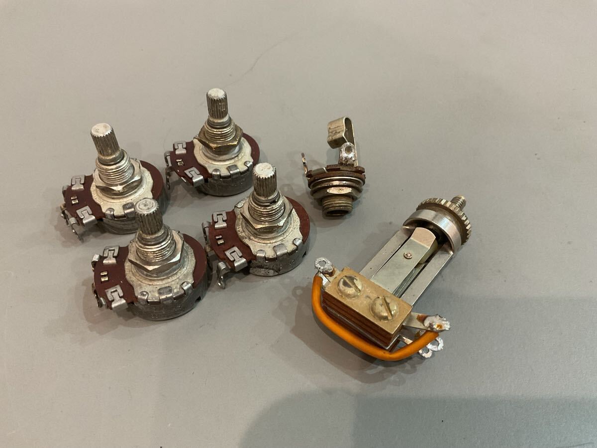 1957年製 CRL 500Kポット4個セットとセレクター ジャックです。珍しいシャフトが割れていないタイプ、長さなどは同じです。セレクター落とし込みナットはarea59です。少し長めのセレクターを通常のサイズにしております。 スイッチクラフト表記無しのセレクターです。134 7 13が2個と 134718が2個です。