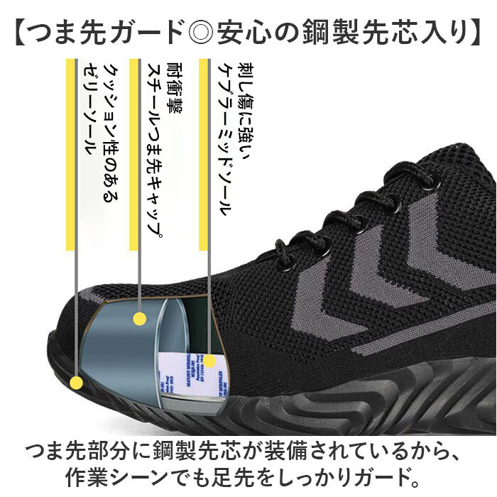 商品説明 | ・・【やや危険の伴う作業時も安心・安全】 ・手軽に使えて機能的。つま先を保護する鋼製先芯入りの、メンズ&レディース安全靴。 ・【見た目は普通のシューズと同じ】 ・作業靴には見えない、スニーカーのような仕上がり。足元がかっこよくキマる! ・【つま先ガード◎安心の鋼製先芯入り】 ・つま先部分に鋼製先芯が装備されているから、作業シーンでも足先をしっかりガード。 ・【フィット感を高めるシューレース】 ・紐の結び具合で多少のサイズ調節が可能。シューズと足が一体化するような着用感。 ・(※)バックにプルタブ付きです。 ・【ムレにくく優しい履き心地】 ・通気性のある柔らか素材。優しく包みこんで、足の疲れやムレを軽減。 ・【取り外せて衛生的なインソール】 ・インソールは、サッと外してお手入れ可能。いつも清潔をキープできる◎ ・【屈曲性があり歩きやすさが向上】 ・足の動きに合わせて柔軟に曲がり、つま先部分は上向き形状。蹴り上げやすくつまずきにくい! ・【鋭利な物から足裏を守る】 ・足底の安全を確保するケブラーミッドソール。瓦礫やガラス破片等が散乱していても足裏を保護。 ・【耐摩耗性があり滑りにくいソール】 ・厚みと溝のある底面。抜群のグリップ力で滑りをガードし、表面硬度の高さもポイント。 ・【普段使いもしやすいカラーリング】 ・年代問わず履きやすい、落ち着きのある万能カラー。アウトドアシーンなどでも活躍。 |
