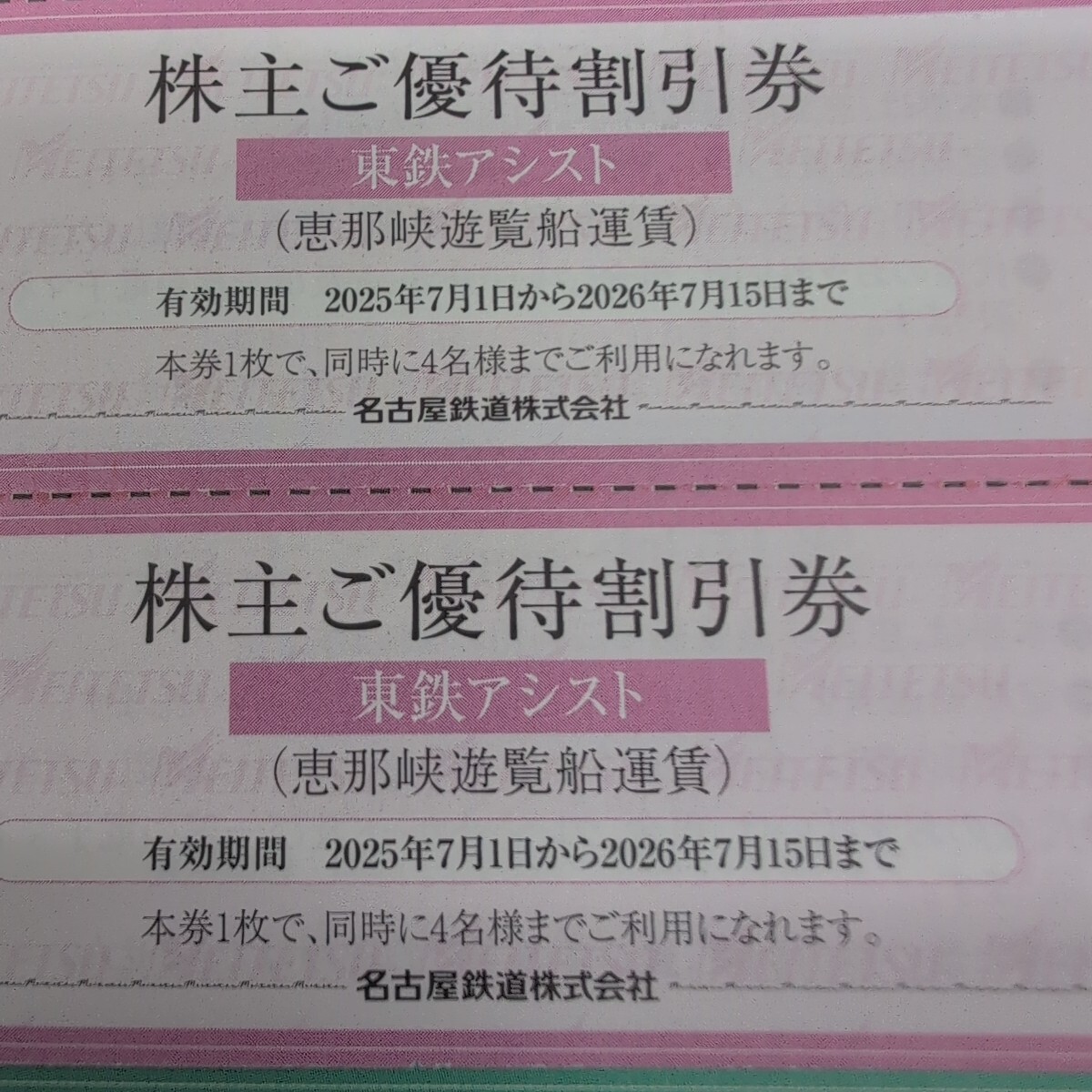 名鉄グループ優待券の恵那峡遊覧船割引券1枚86円(普通郵便送料込み)になります。本券1枚で4名様まで定期船運賃を大人1100円、小人550円に割引します。2026年7月15日までご利用出来ます。