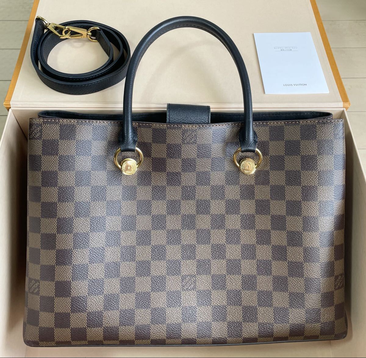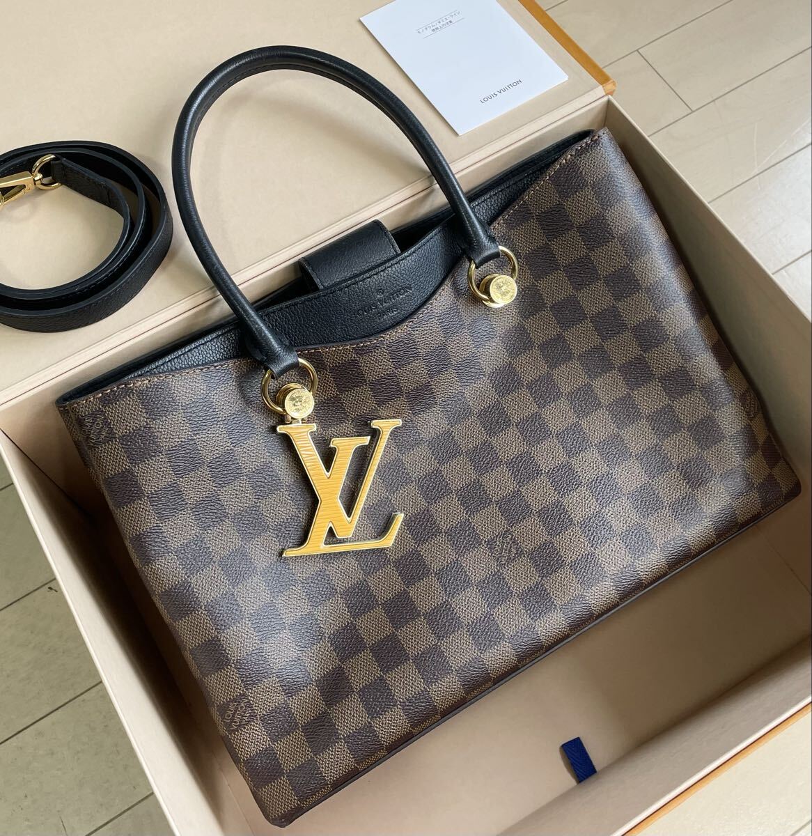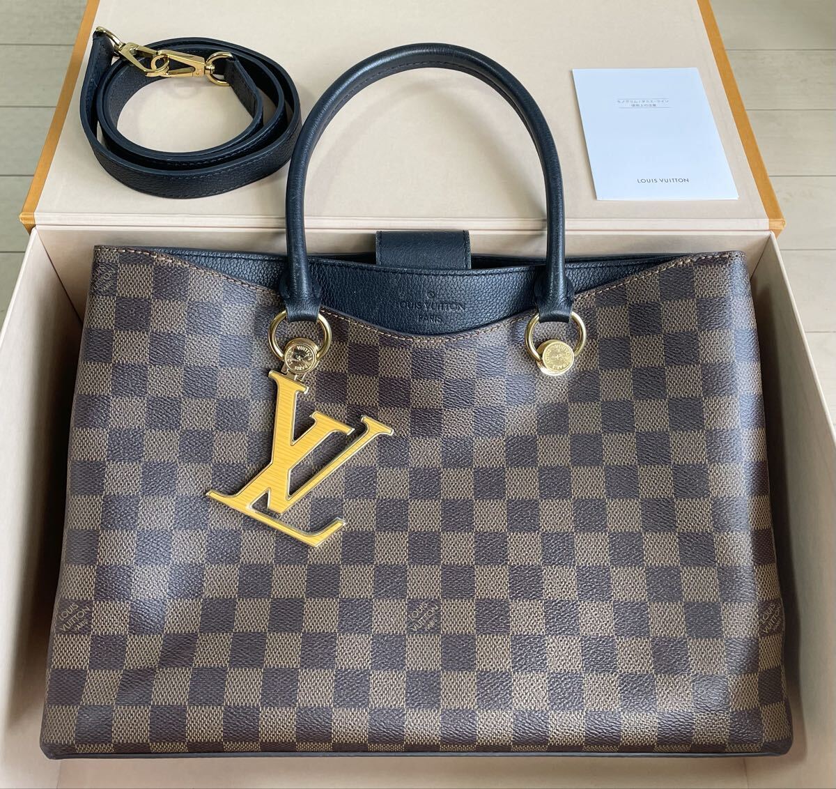 洗練されたスタイリッシュなダミエラインの「LVリバーサイド」。エピレザーを想わせるレジン製のLVチャームが上品なデザインのアイテム。ショルダーは取り外し可能、コーディネートに合わせて2wayでお使い頂けます。