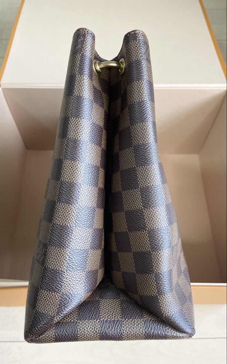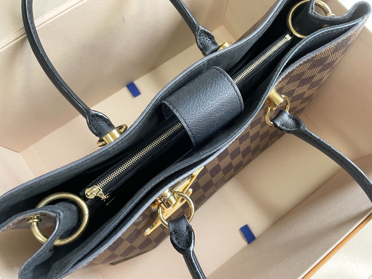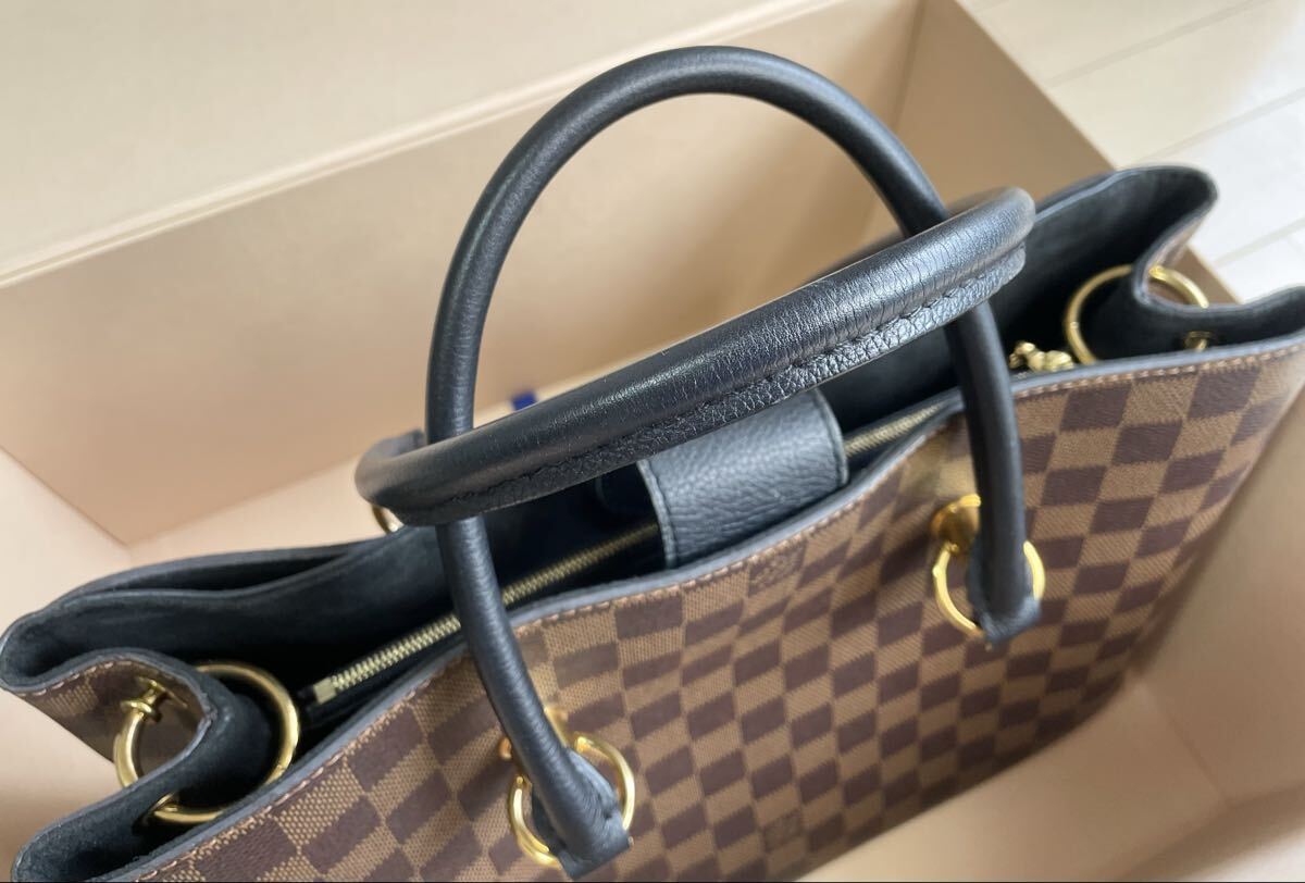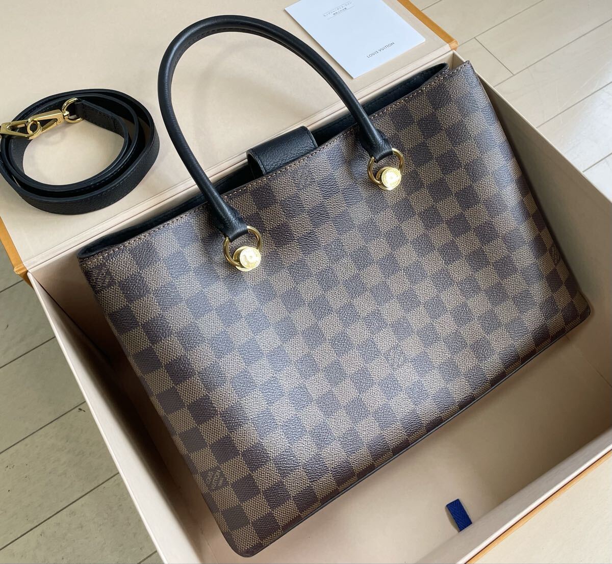 洗練されたスタイリッシュなダミエラインの「LVリバーサイド」。エピレザーを想わせるレジン製のLVチャームが上品なデザインのアイテム。ショルダーは取り外し可能、コーディネートに合わせて2wayでお使い頂けます。