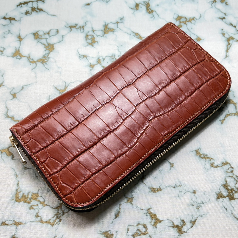 ポロサスレザー(センターカット:コニャック) ラウンドファスナーロングウォレット スモールクロコダイル