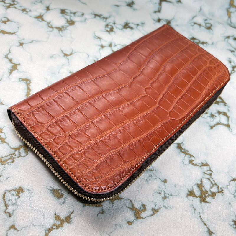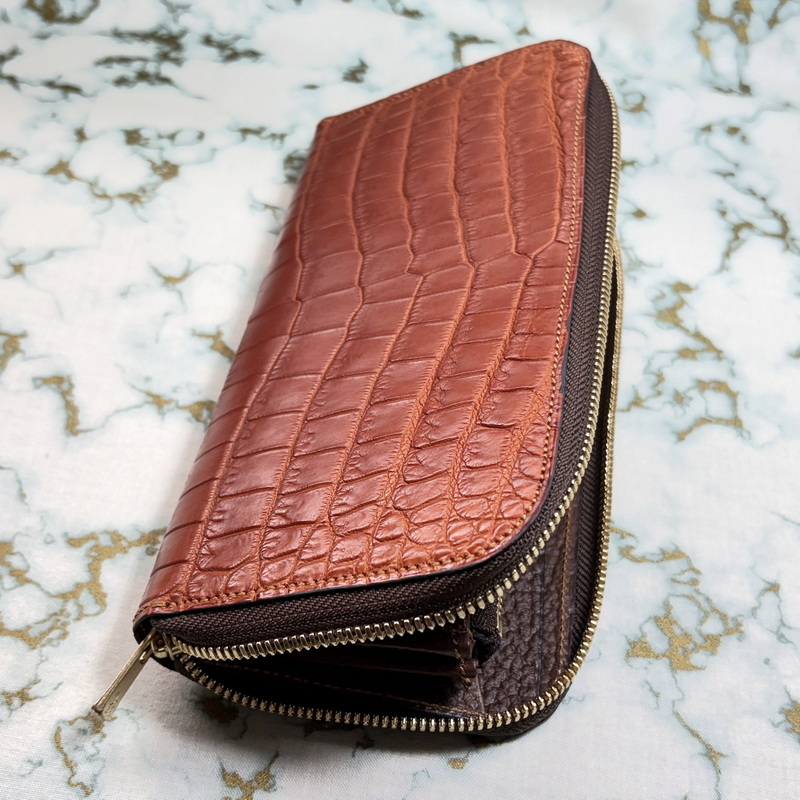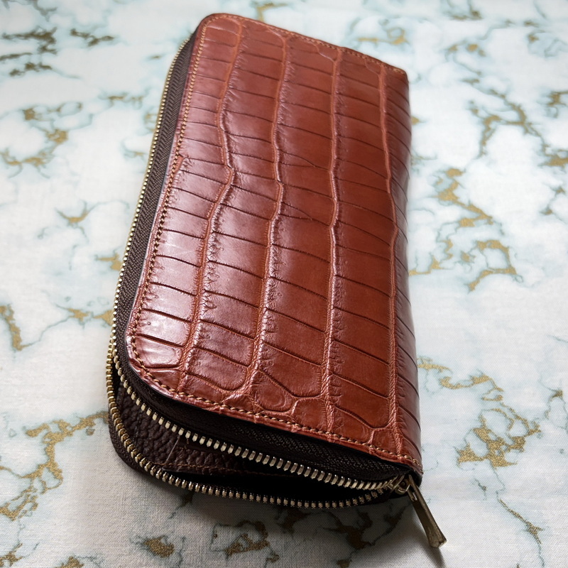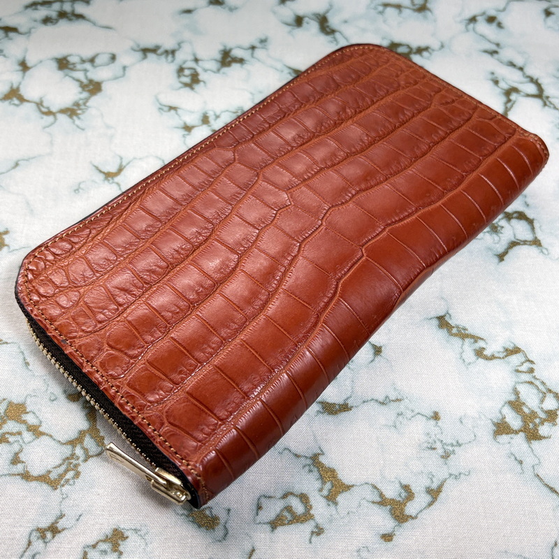 【新店記念特別出品】firebird【凪:Lサイズ】ポロサスレザー(センターカット:コニャック) ラウンドロング スモールクロコダイル 日本製
