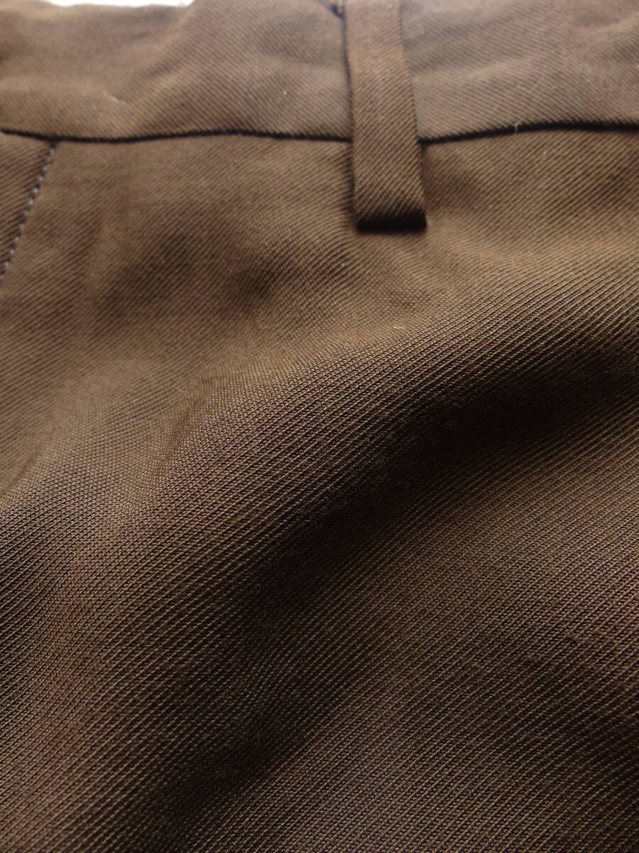 バイアス織りビスコース生地のビジネススラックス。プレフォール品で秋冬春3シーズン、もしくは季節を限定しない通年物になる感じです。ほんのり赤味を帯びたダークブラウンがポイント。ブラウン系は暗く重たくなる色味と、明るく軽くなる色味があって、今回のパンツは後者のタイプ。若々しく軽やかに見えて第一印象で好感度が高い茶系パンツです。スタイルデザイン的には特別な説明は不要のビジネス定番物。高級品だけに納得のハイクオリティです。ジョルジオクラスの上質をお求めのお客様にもお勧めできるお品になります。