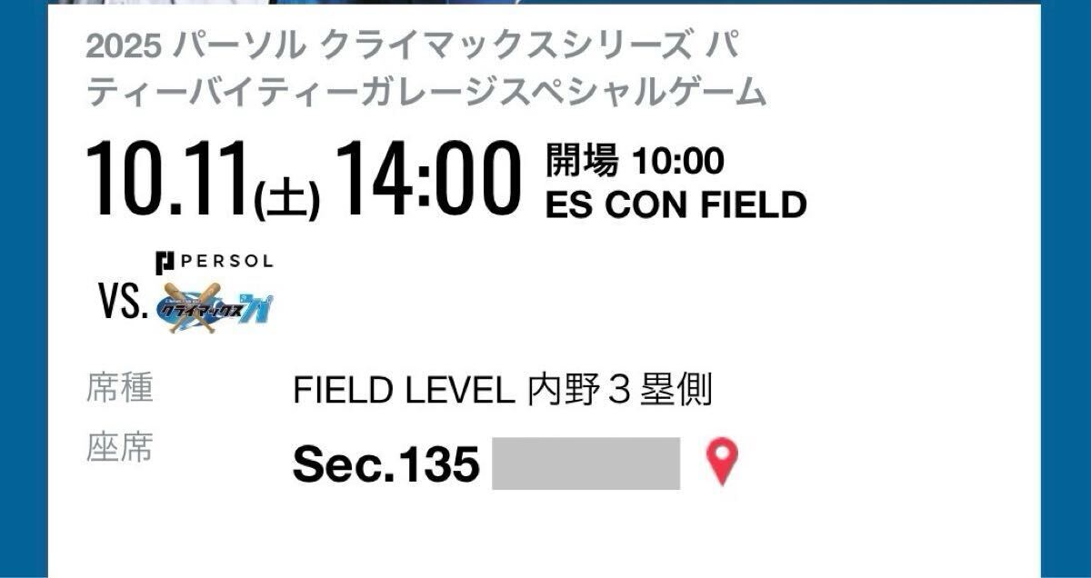 10月11日 北海道日本ハムファイターズ ESCON FIELD クライマックスシリーズ ペアチケット 通路側2枚連番