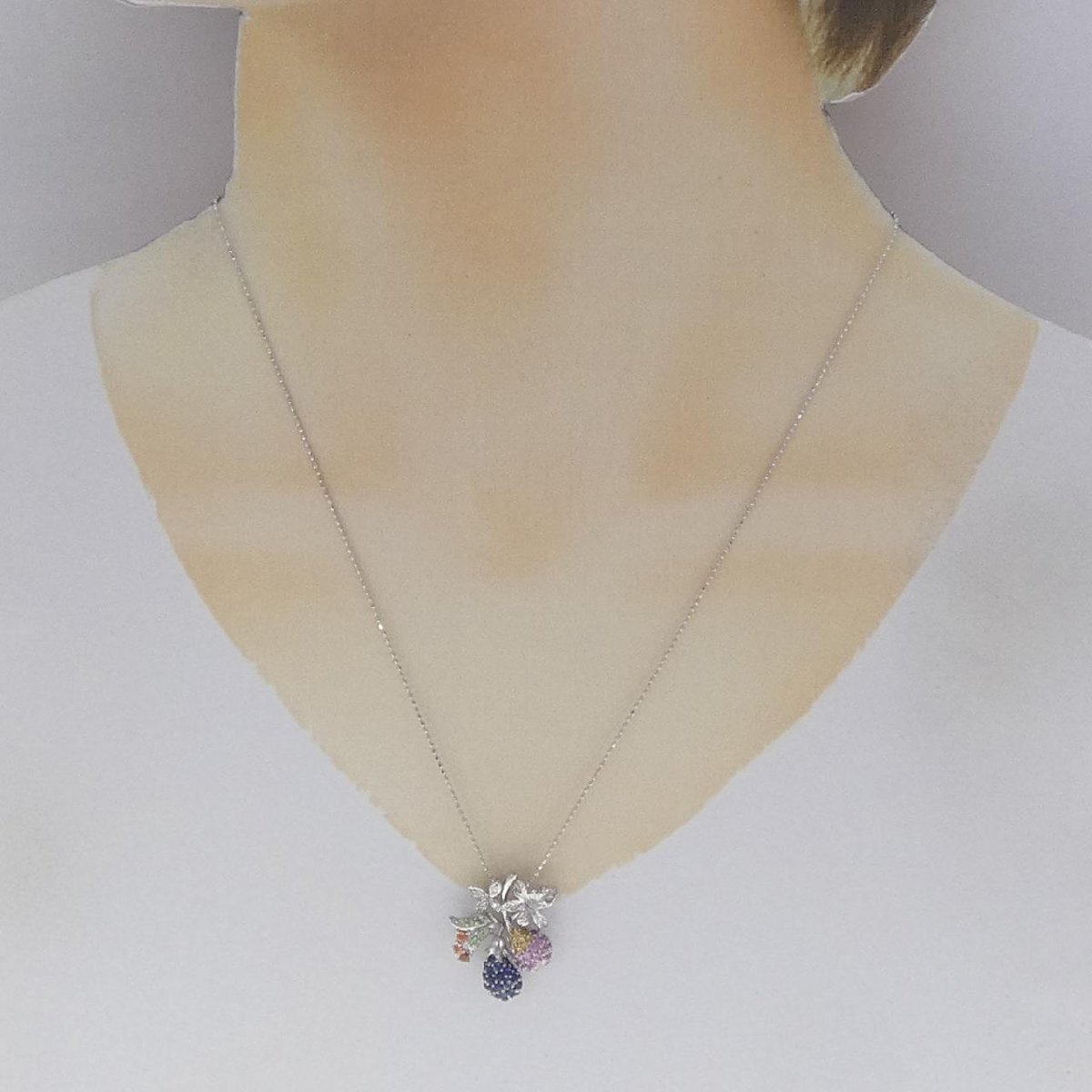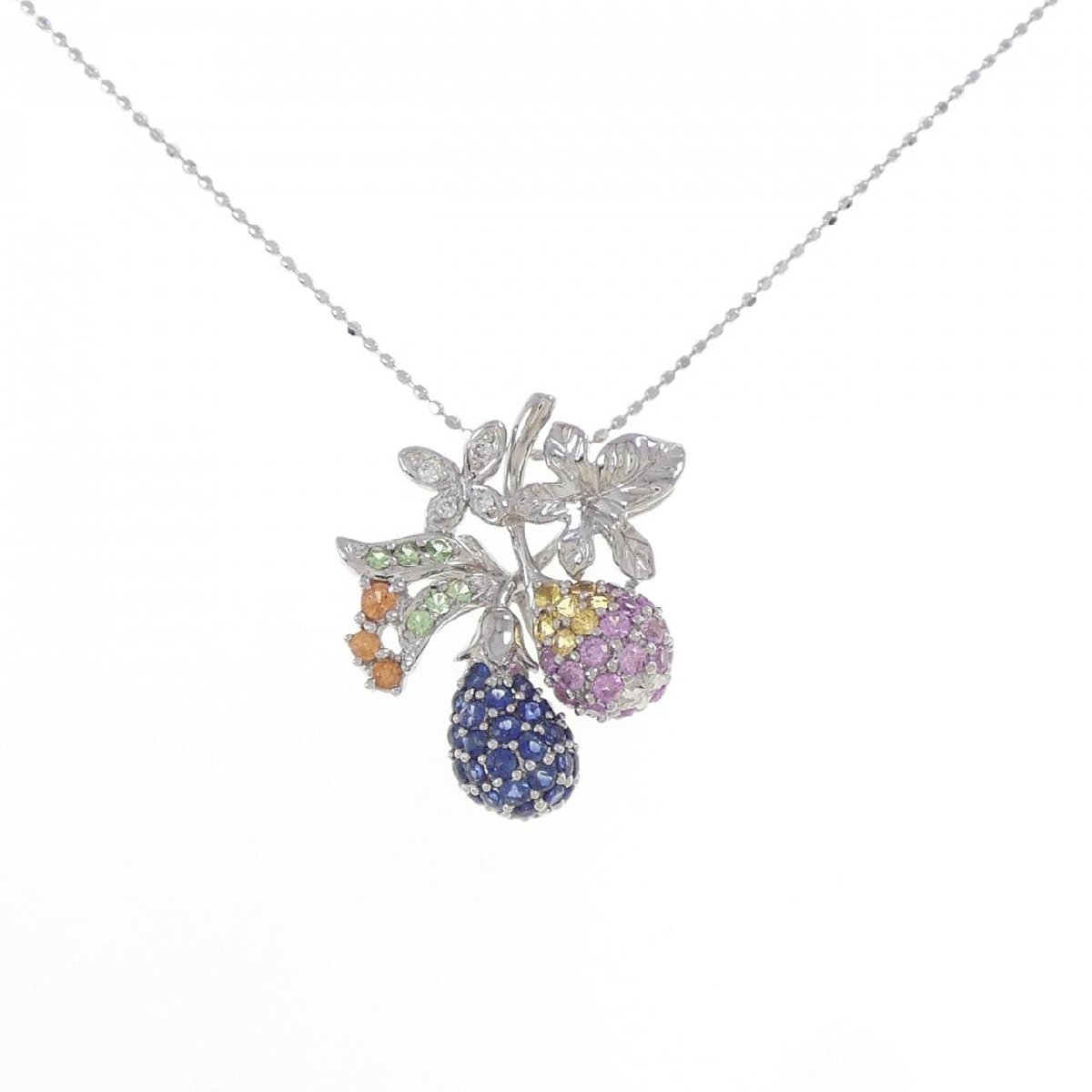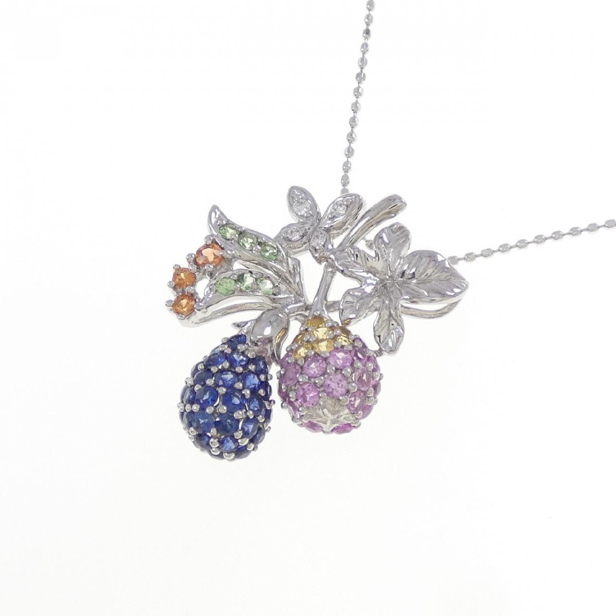 色彩豊かなサファイヤとガーネット、細かな光を放つダイヤモンドをセッティング。植物のモチーフが胸元を可愛らしく飾るジュエリーです。