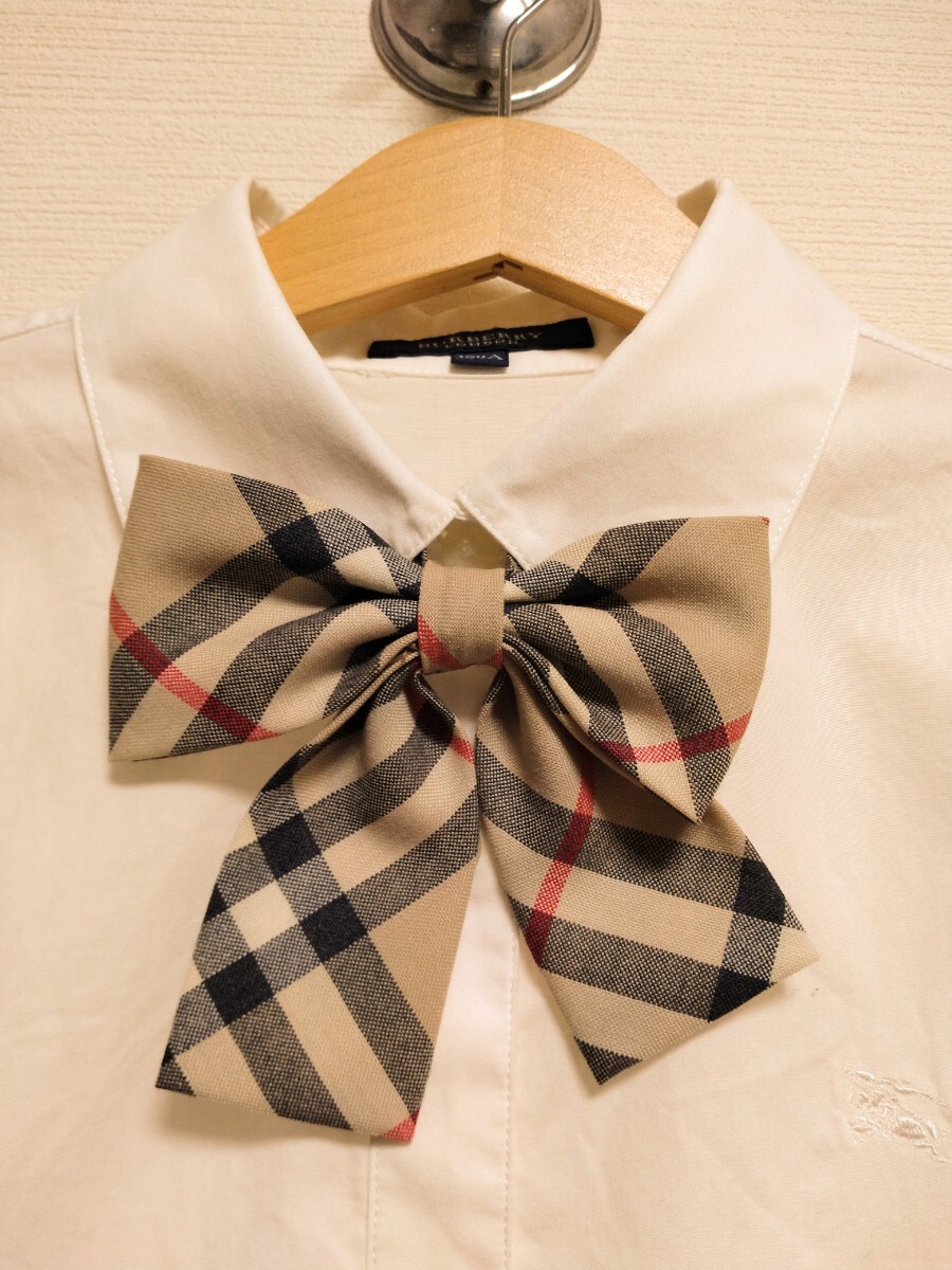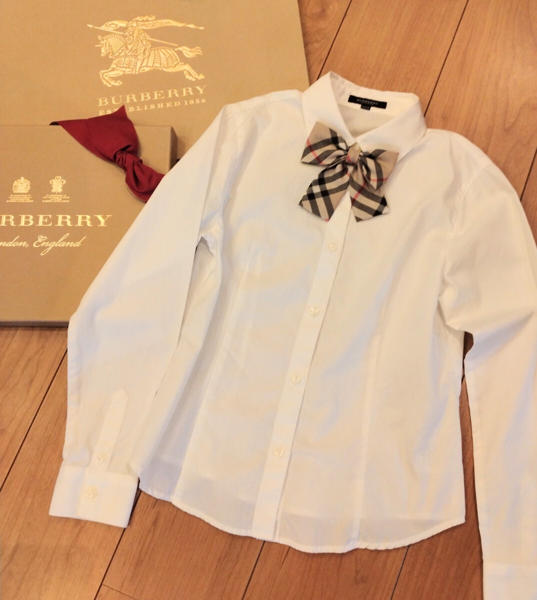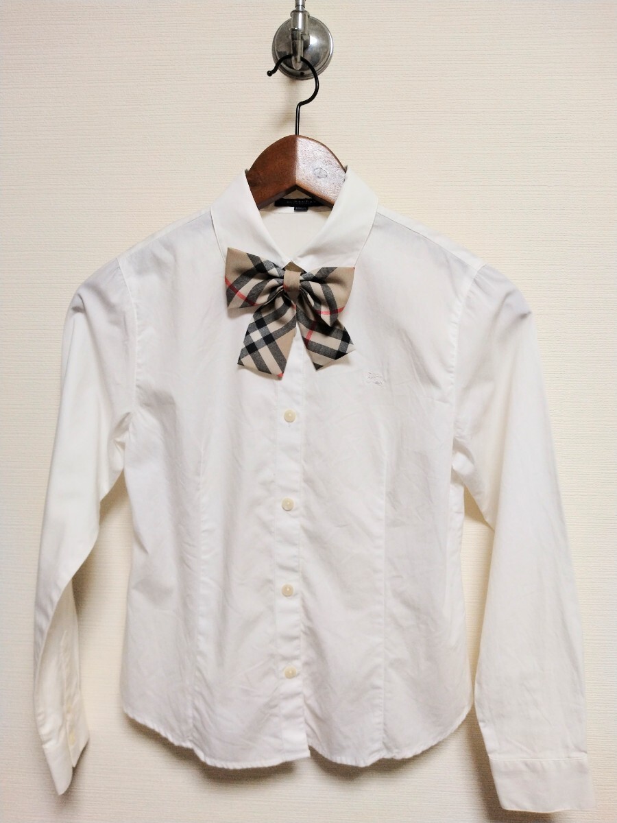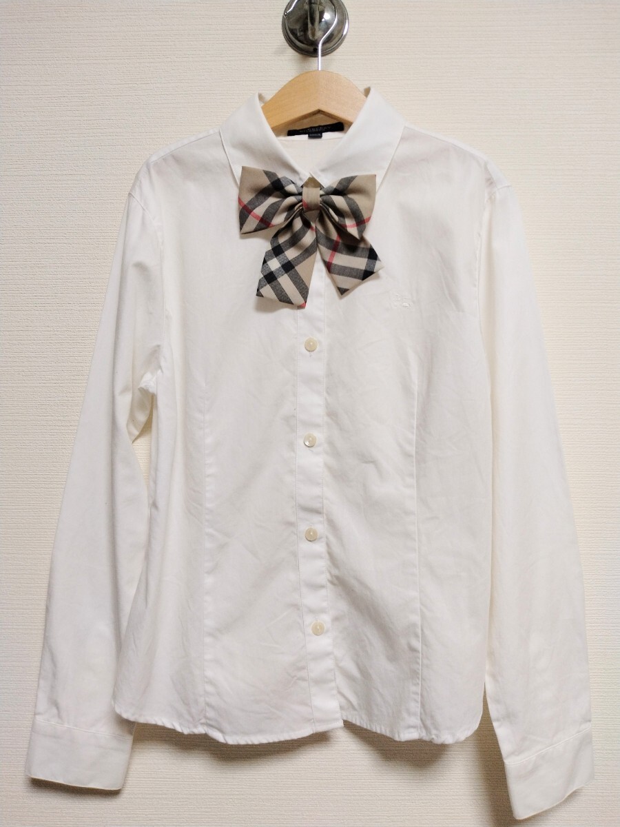今では入手困難なバーバリーのリボンタイ付きシャツです。発表会や、卒業式、結婚式のお呼ばれ等にも。一目でバーバリーと分かり、とても可愛いです。袋等付属品は付きません。