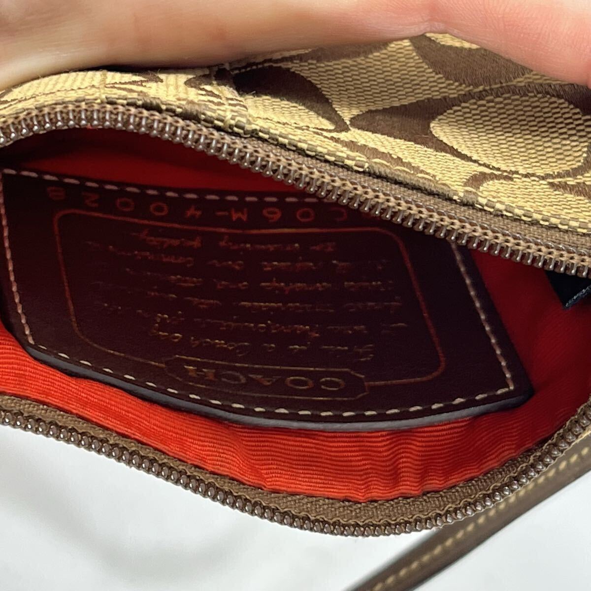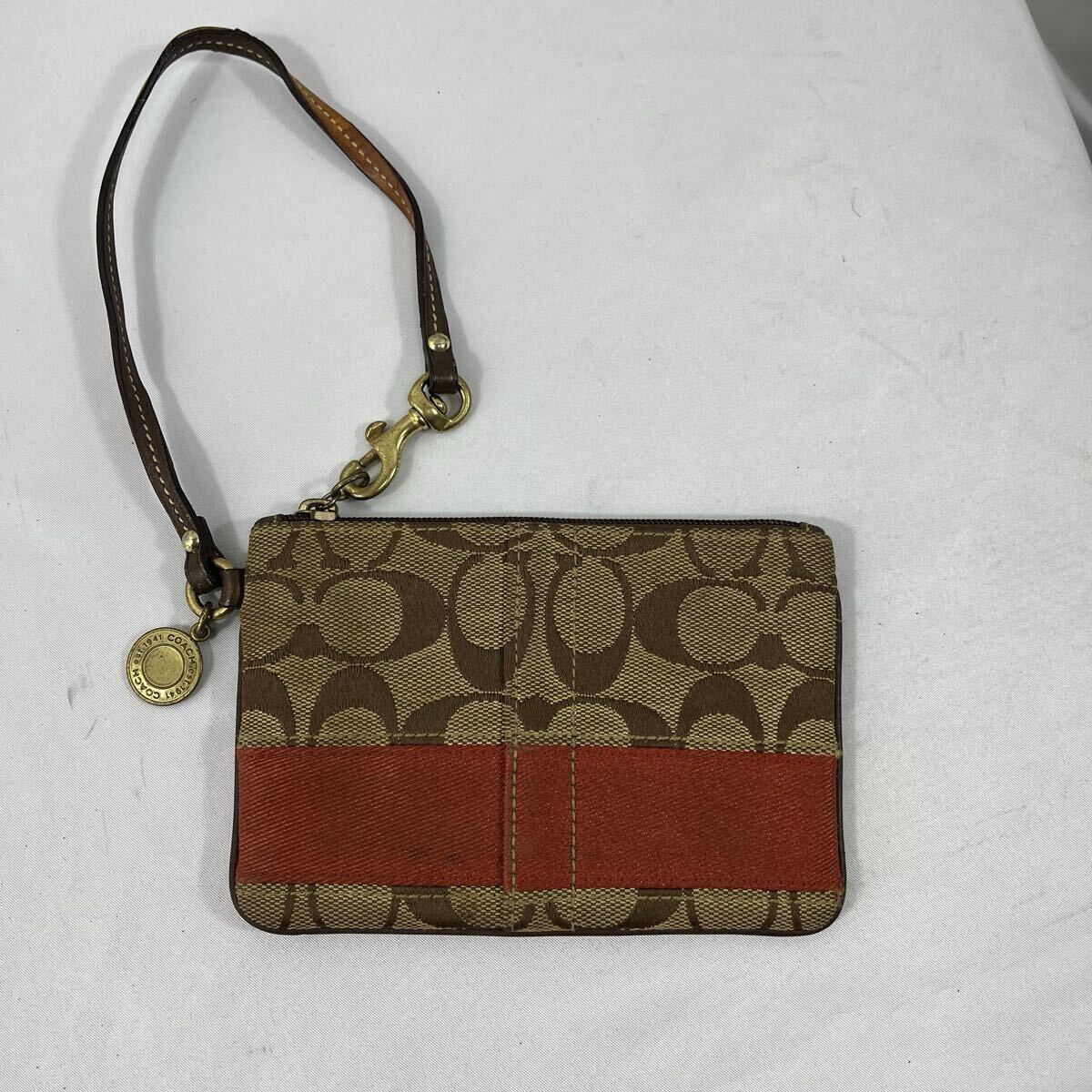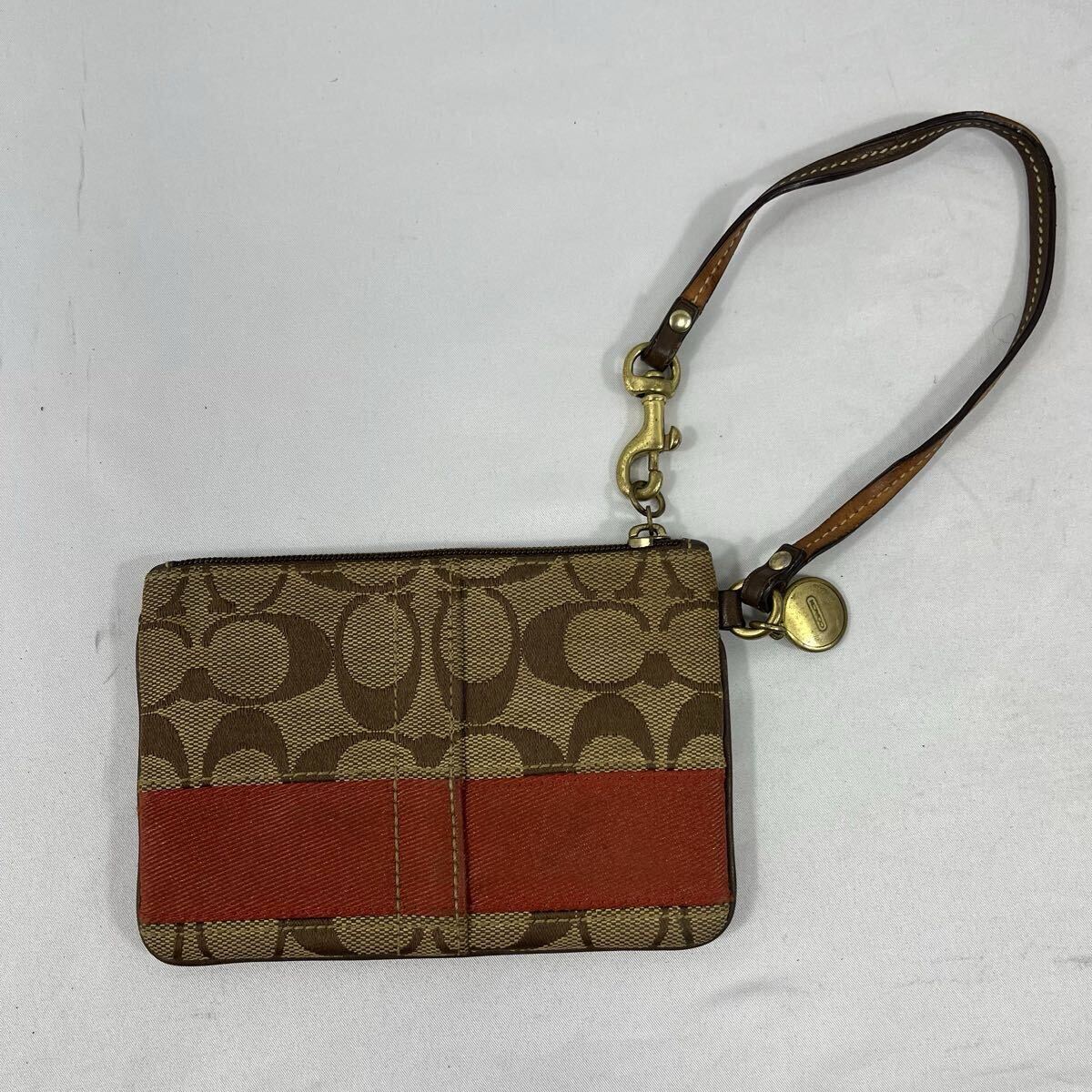 ・ブラウンとレッドのコントラストが魅力的なCoachのストラップ付きポーチ。
