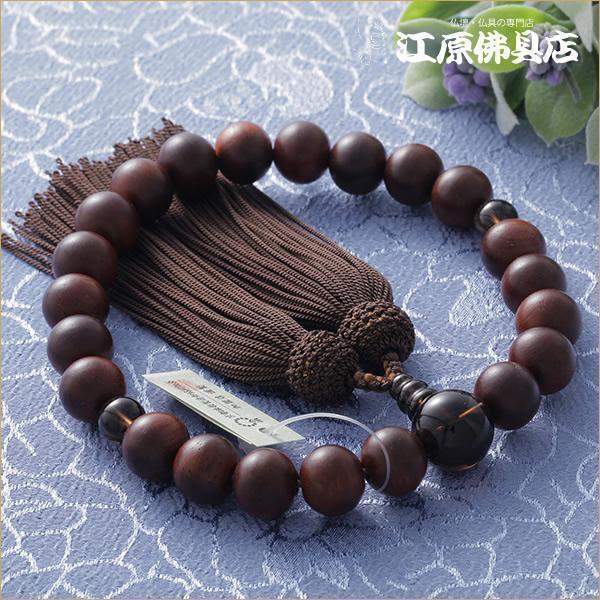 ・仏壇仏具の材料に用いられる高級木 朱丹の数珠です。艶だしをせず、木の持つ風合いをそのまま生かした素材は、あたたかみがあり、手ざわりもさらっとして気持ちよく手に馴染み、味わいが増してきます。アクセントとして人気の茶水晶を使用した男性用の数珠でございます。