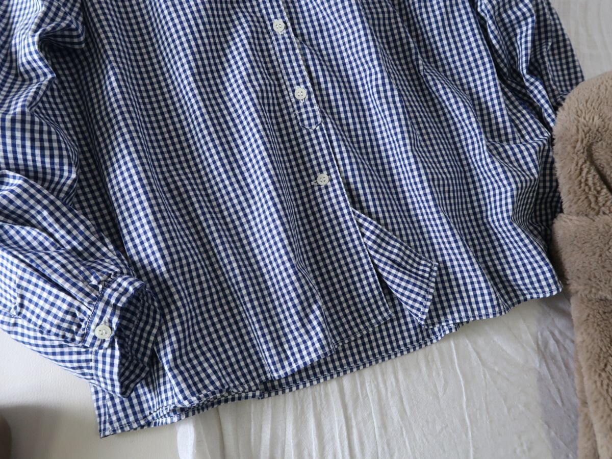 丸襟デザインが愛らしい表情をプラスするギンガムチェックブラウス。