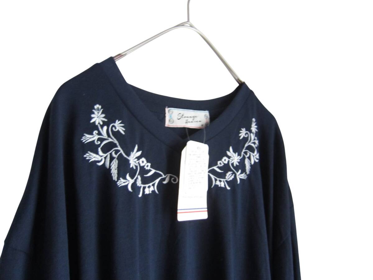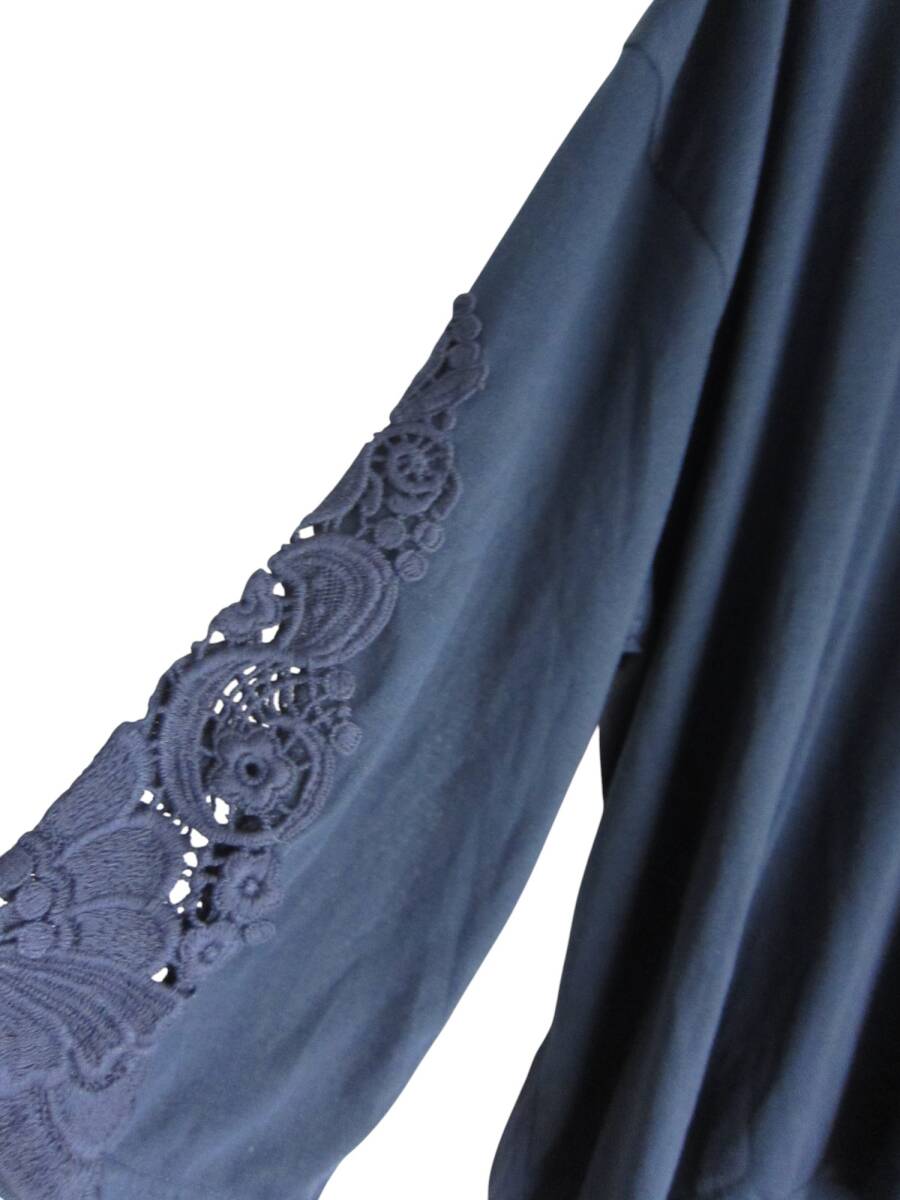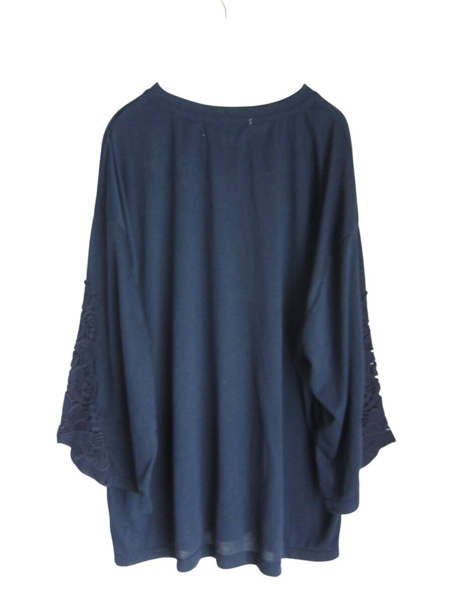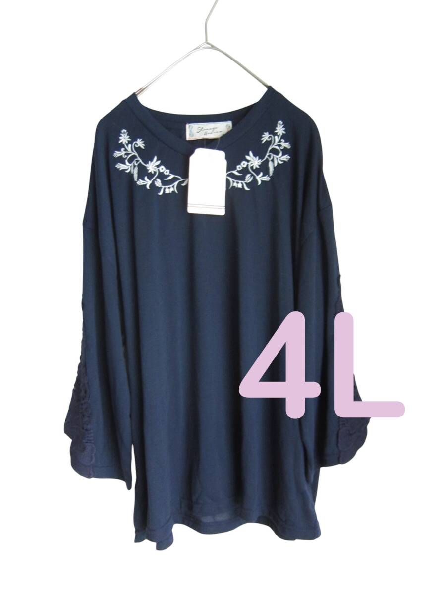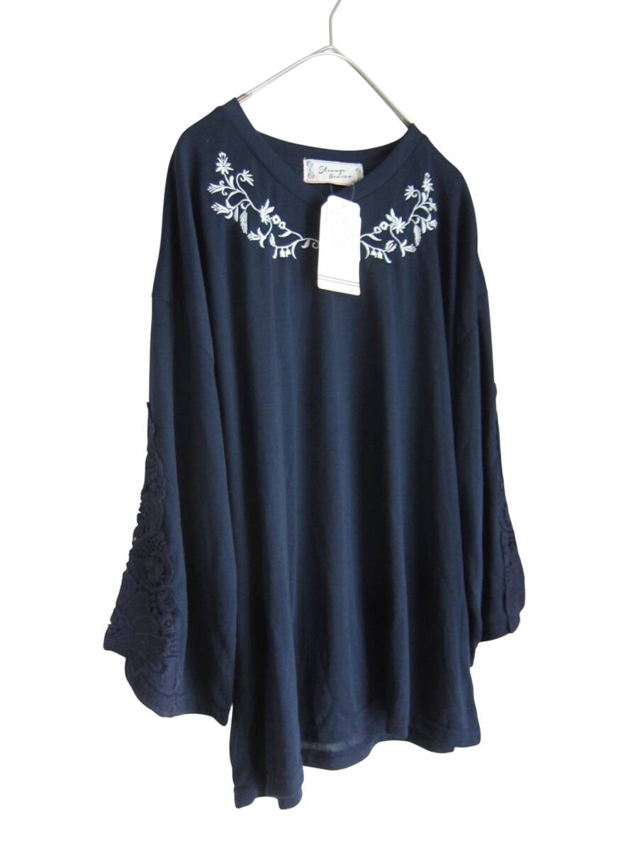 ★送料無料 Z114 新品 【4L】 ~5L着用可 ネイビー 袖レースモチーフ 胸元刺繍 7分袖 カットソー 大きいサイズ