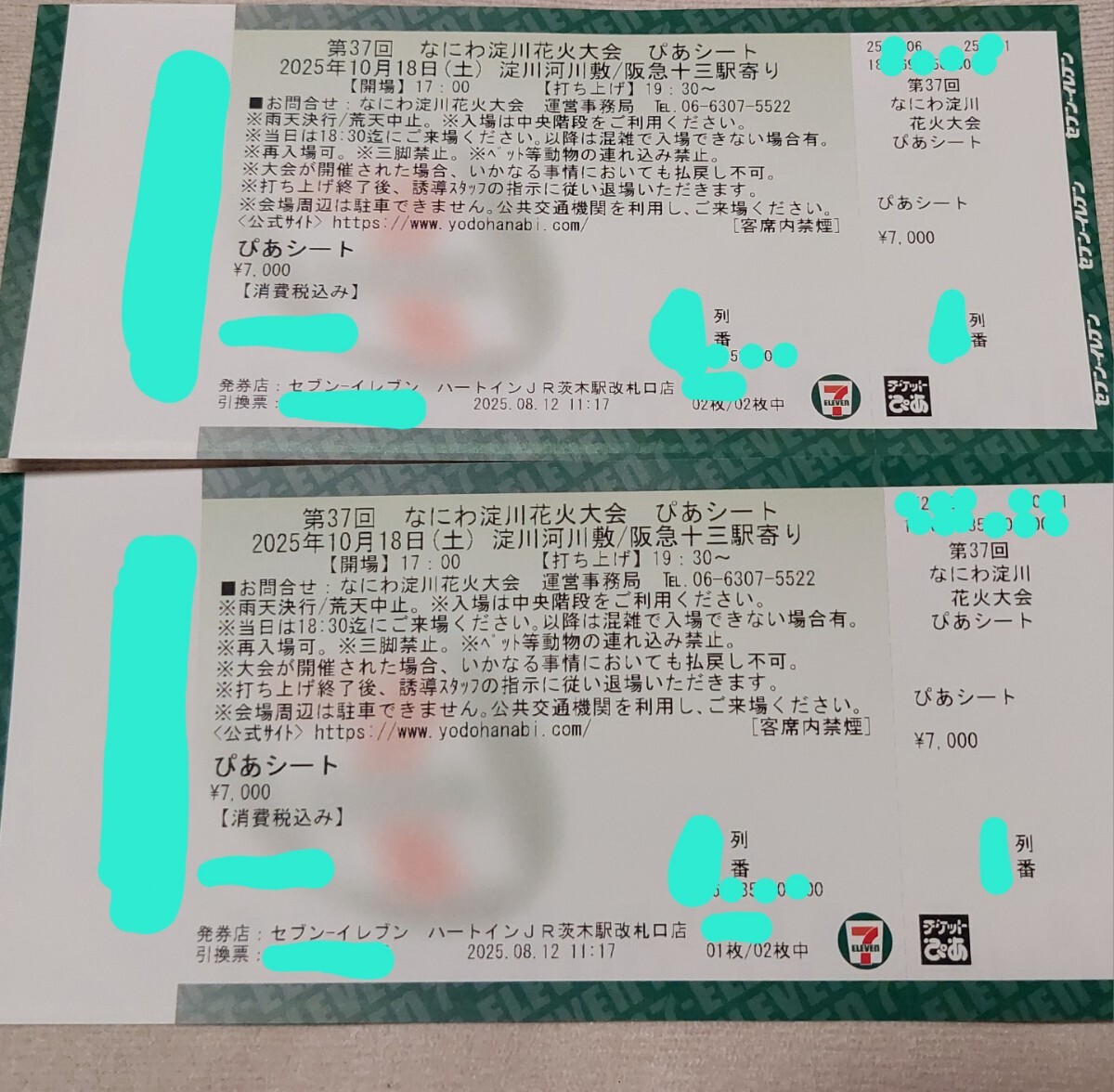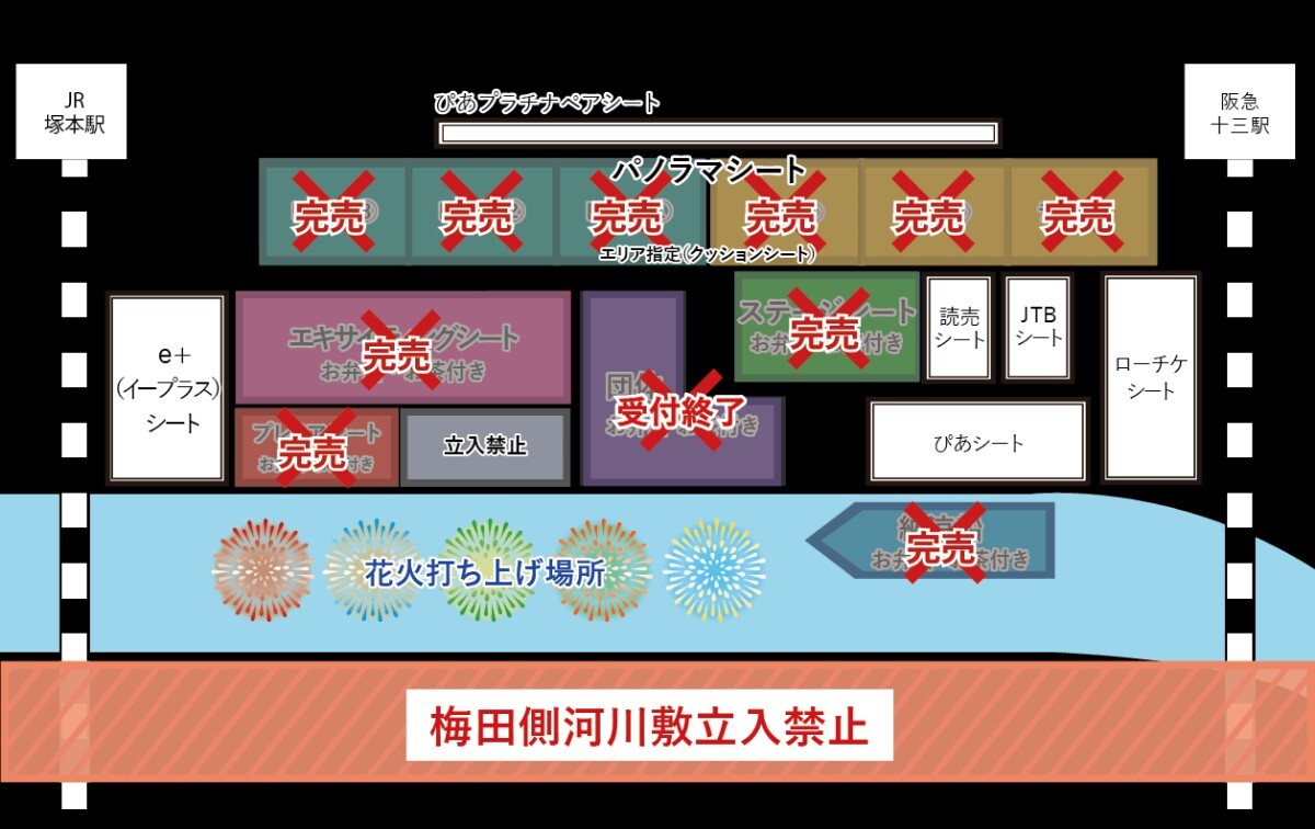 10月18日開催のなにわ淀川花火大会のびあシート・パイプ椅子席・指定席・トイレ有・屋台近い、なので楽に観れると思います。