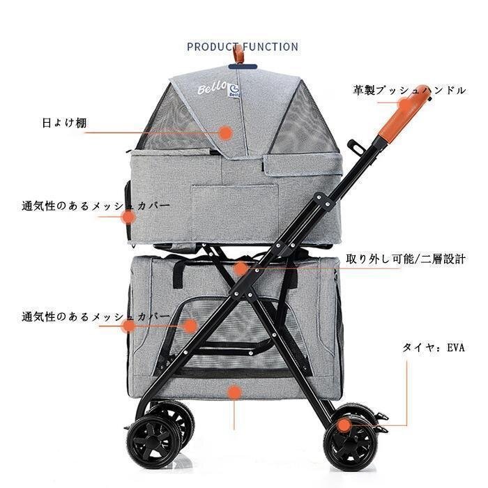 ペットカート キャリーカート 折りたたみ 取り外し可能 二層設計 ペットバギー 犬 猫 2WAYS使用 多頭 組立簡単 通気性抜群 shw0021.bl