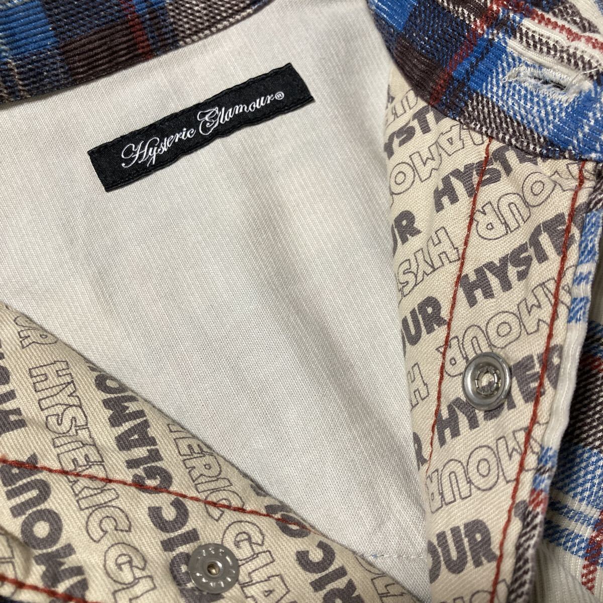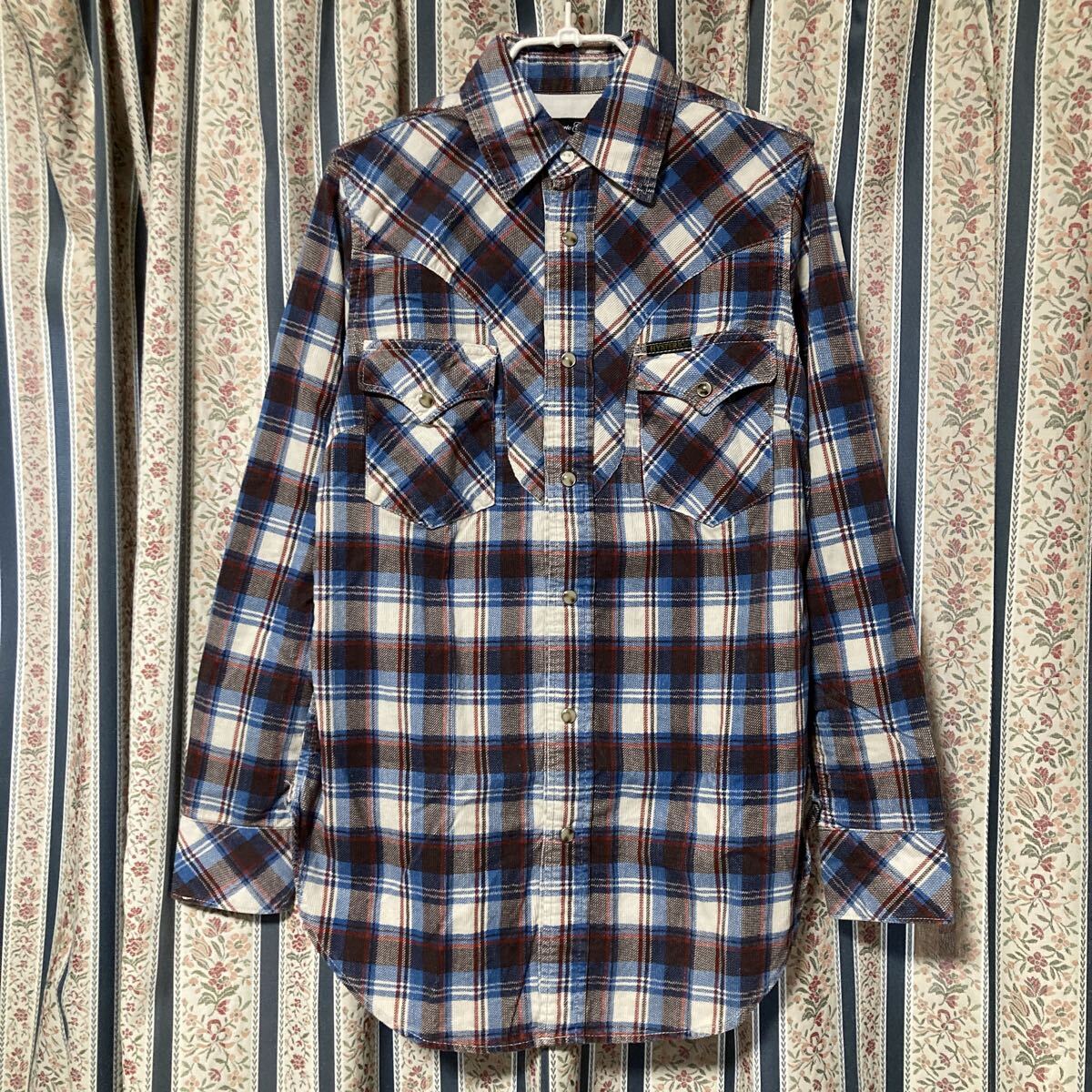 切り替えやフラップポケット、スナップボタンと本格的な作りのウエスタンタイプの長袖シャツ。