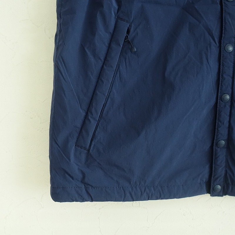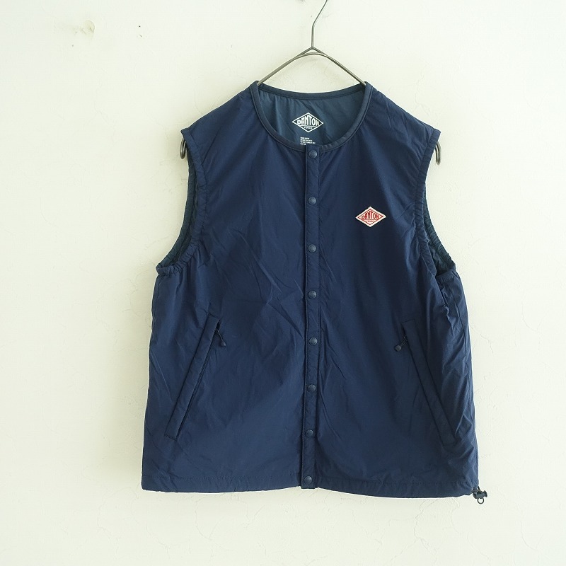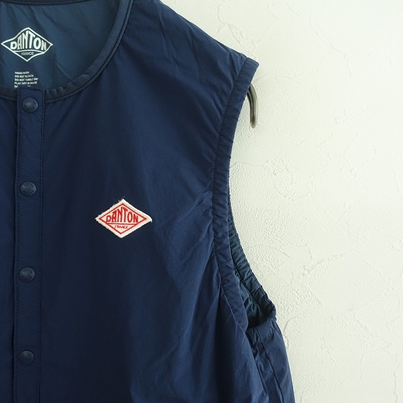 DANTONのインサレーションベストです。カラーはネイビーで、独特なハリ感と程よい光沢感のあるナイロンタフタ素材で、 薄中綿入りのライトな素材で仕立てられております。フロントはスナップボタン仕様で、裾はドローコード入り、両腰にジッパーポケット付きです。インナーベストとしてもご利用いただけるアイテムです。定価(メーカー希望小売価格)16,280円 税込みの商品です。 |