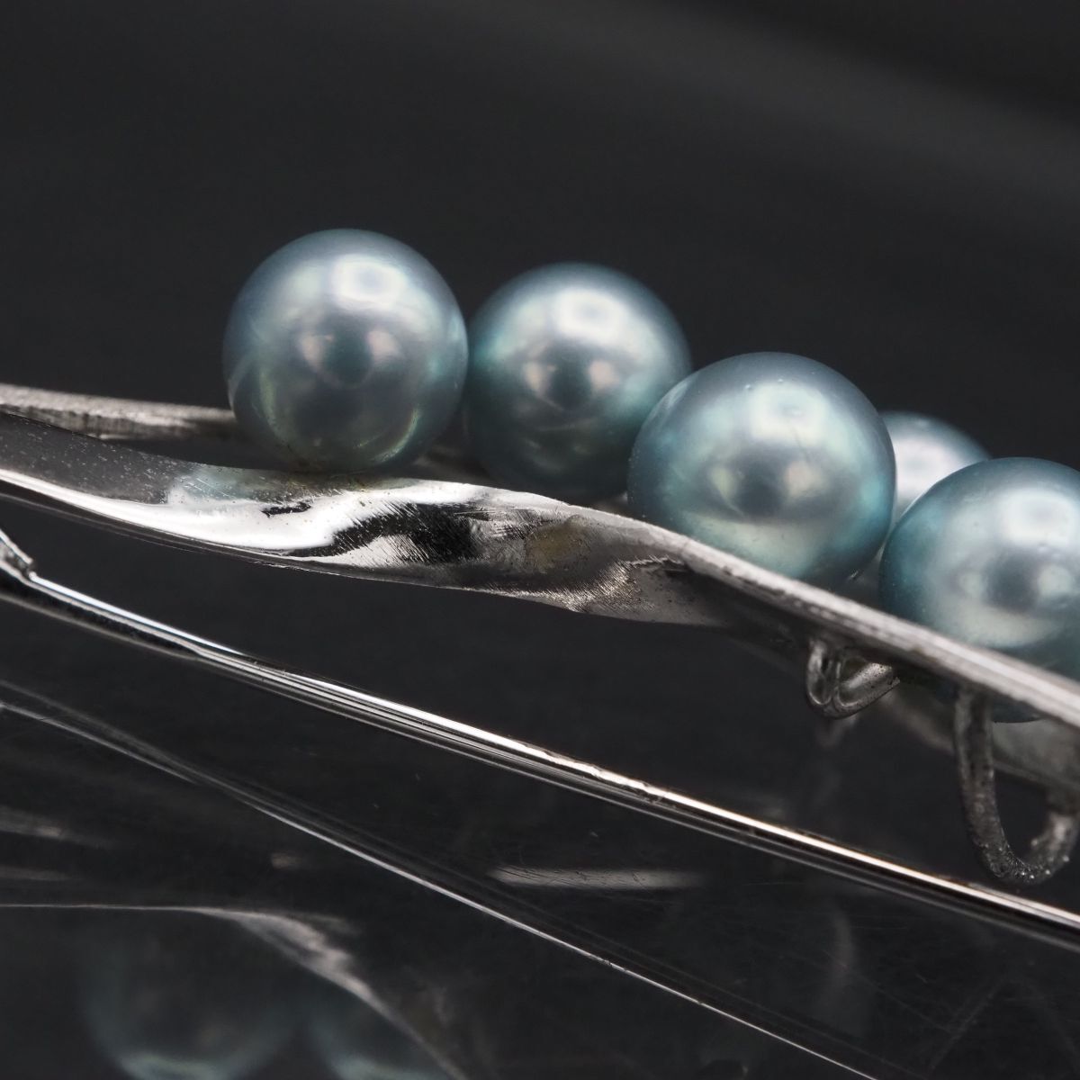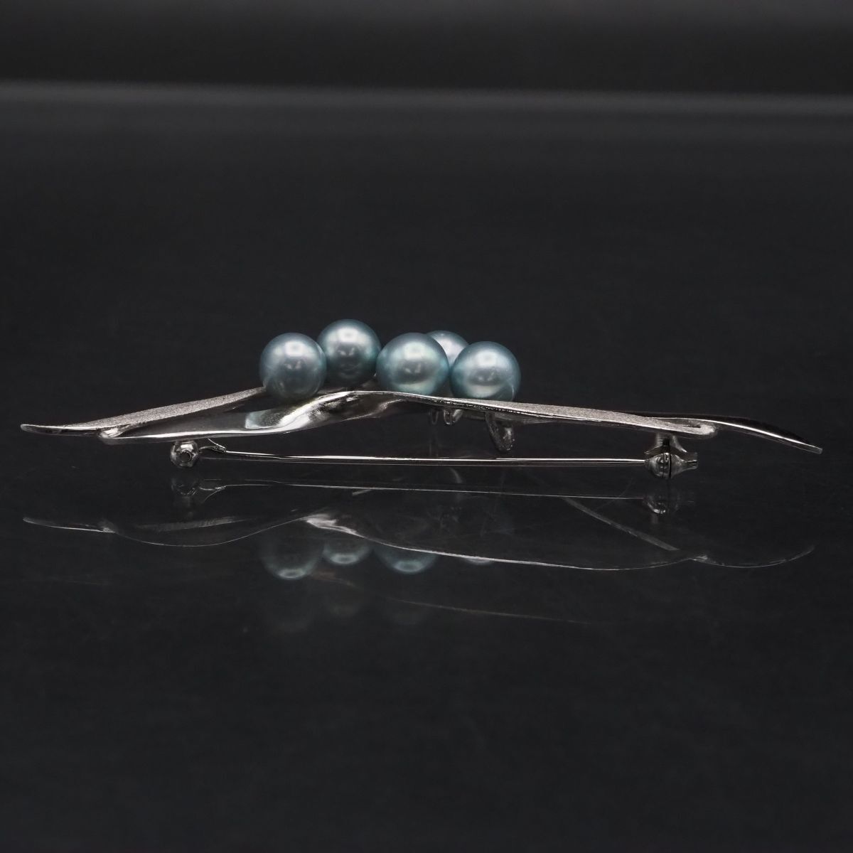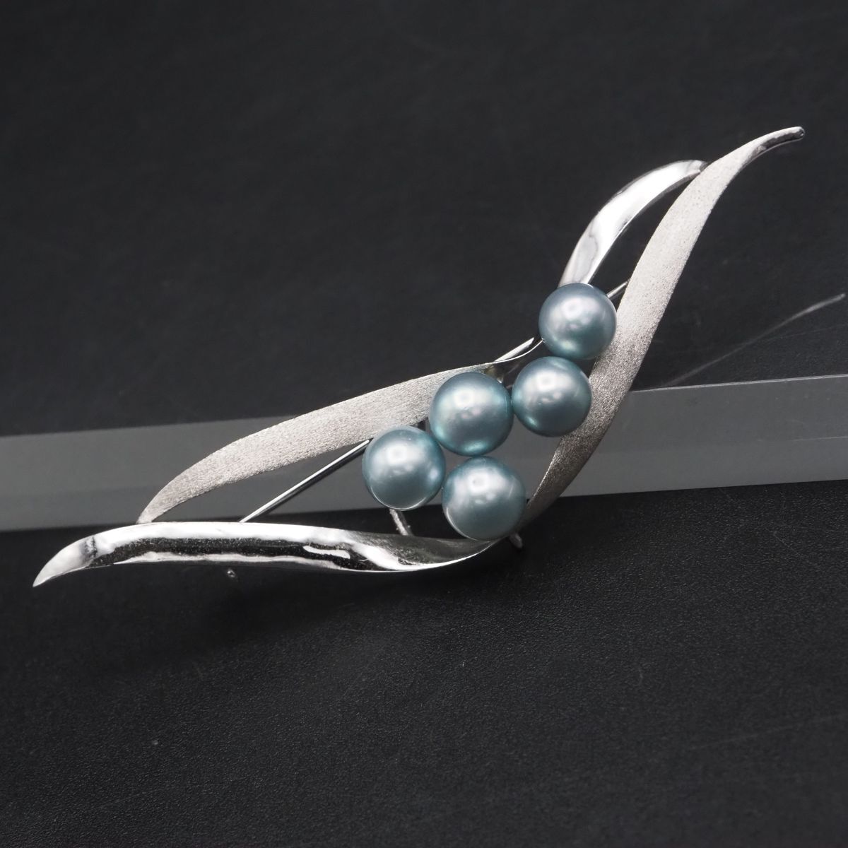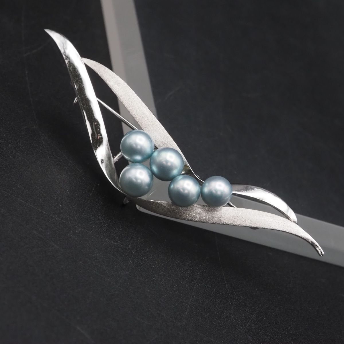 F801 本真珠 6.3-6.9mm5珠 パール S刻印 ブローチ ブルー系カラー デザイン シルバー コサージュ 6月誕生石