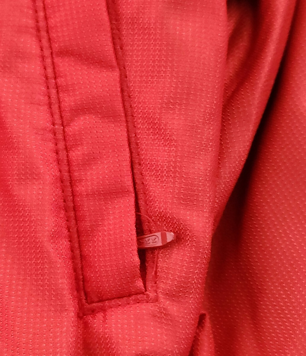 鮮やかな赤×ブルーの切替、リブ仕様のレトロデザインが魅力。