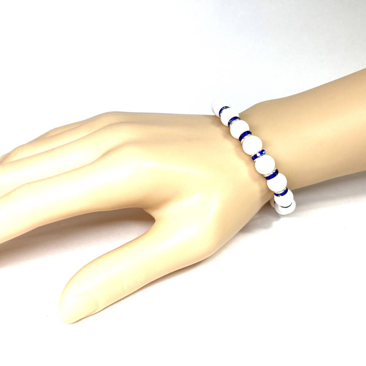 こちらは、ホワイトオニキスの8mm玉を使用したパワーストーンブレスレットです。石との間にはロンデルを挟み高級感を演出しております。シンプルなデザインは、シーン問わずどんなコーディネートとも合わせ易いブレスレットです。サイズは内径約15cmです。当社の中でも一番人気の実績があるデザインとなっております。気になる方はお早めにどうぞ。