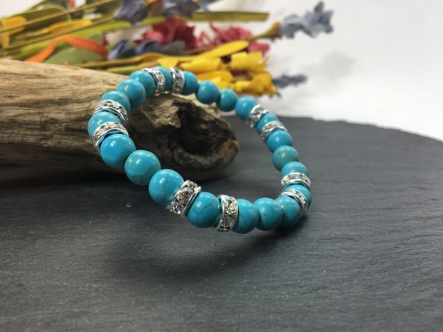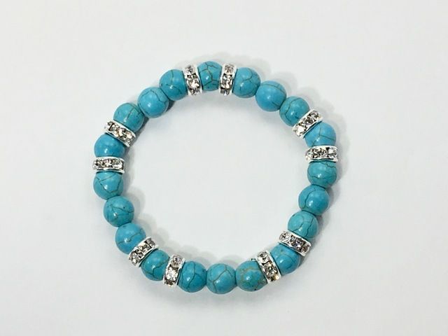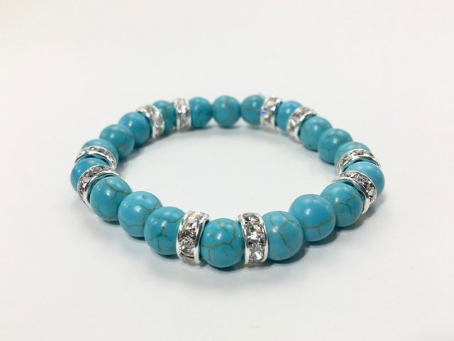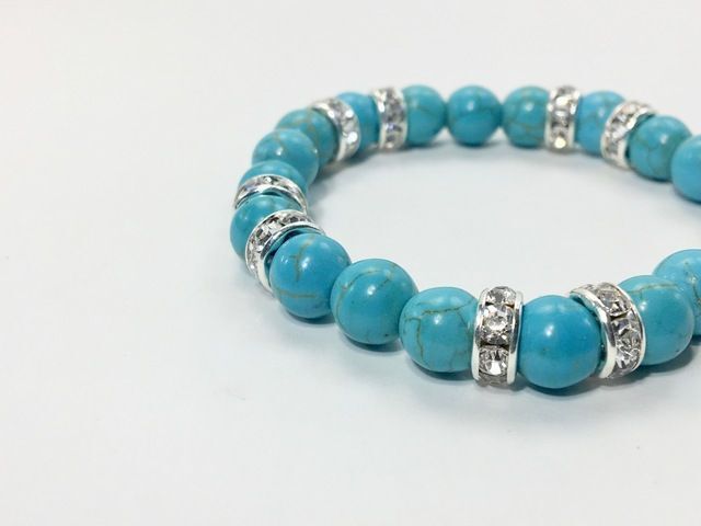 こちらは、8mm玉のターコイズを使ったパワーストーンブレスレットです。シンプルなデザインでどんなコーディネートにも合わせやすいデザインに仕上げています。サイズは内周約14cmです。気になる方は是非この機会にどうぞ。