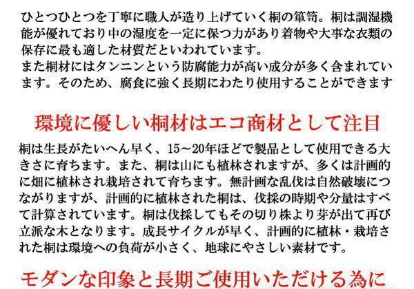 桐の素材の風合いをそのまま活かして作られた引出し箪笥は、落ち着きと高級感があり、どんなお部屋にも馴染みます。 シンプルなのに高級感のあるデザインが◎ 桐の効能と和・洋どちらにも馴染む桐箪笥です。 通常の桐箪笥とは違い、天板に重い物を載せれる様に、15mm厚の2枚重ねを採用。 強度にもこだわった贅沢な造りです。 本体は天板下・真ん中・下段に地板を入れその他の段にも強度を保つ為の桟を使っています。 細部までこだわった丈夫な造りを実現。 末長く御愛用頂ける商品です。 | |