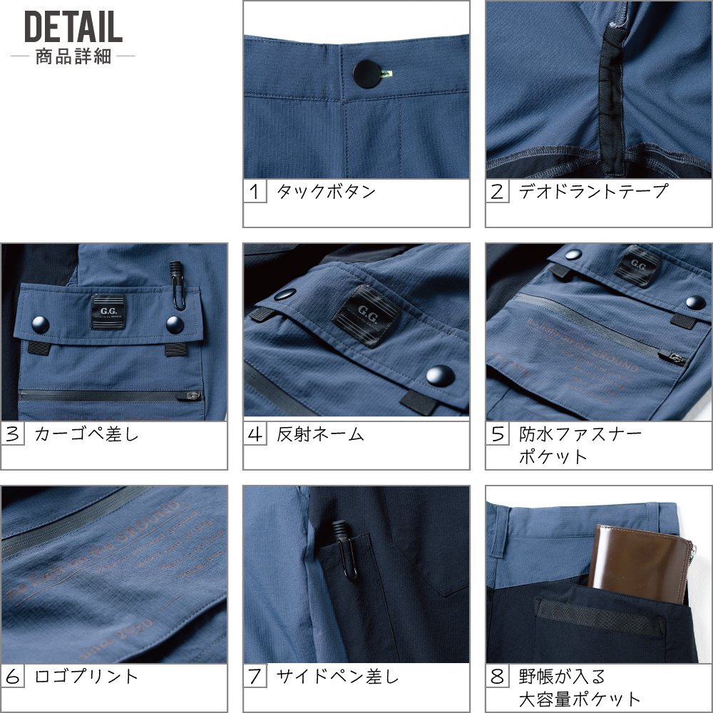 仕様:ストレッチ 吸汗速乾 サイドペン差し 野帳が入る大容量ポケット 消臭 冷感 反射プリント