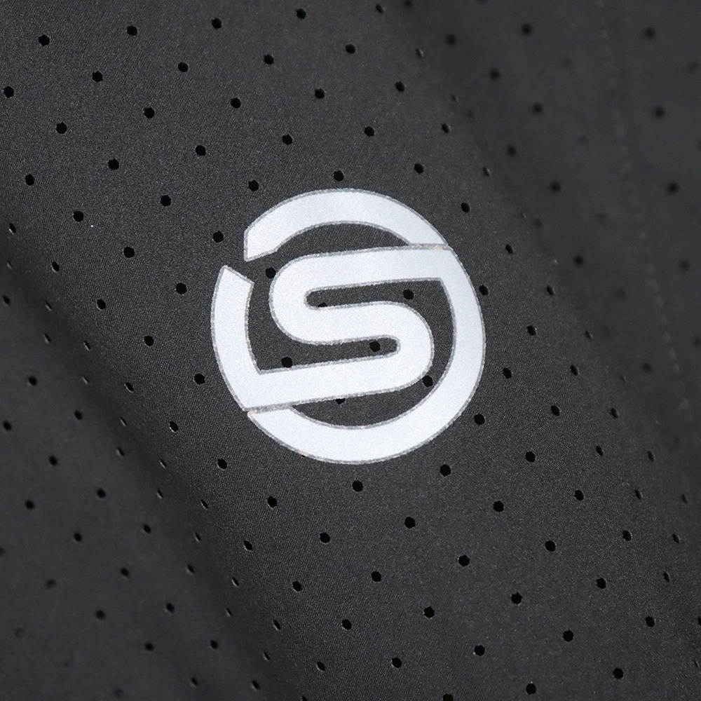 背面ポケットにはファスナー付きで、スマートフォンや小物などが落下する心配はナシ。SKINSマークとSマークはそれぞれ再帰反射になっており、夜間の視認性も確保しています。