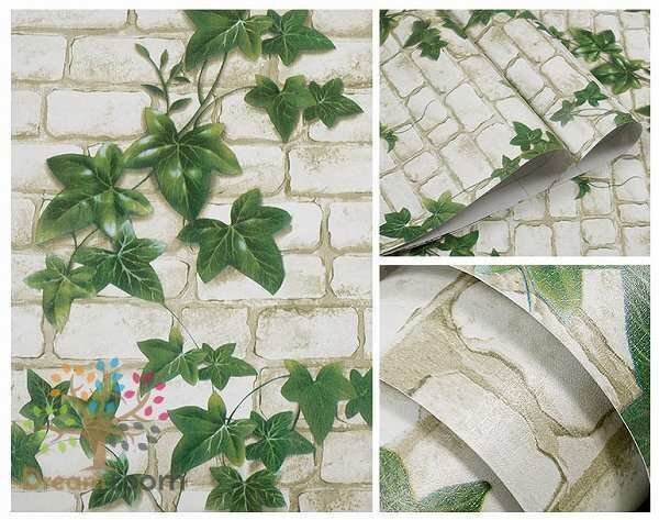 【 30m 】 3D 白レンガ×葉っぱ リーフ ウォールペーパー ビンテージ 石垣 ストーン 壁紙 北欧風 インテリア はがせる シール DIY