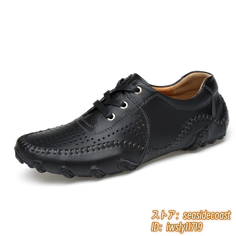 夏新品★スリッポン ローファー 本革 透かし彫り ドライビングシューズ 牛革 ゴルフシューズ イギリス風 快適 メッシュ ブラック 28.0cm