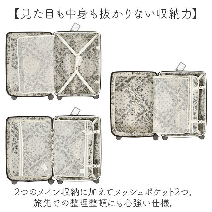 商品説明 | ・・【旅の相棒にぴったりな頼れる存在】 ・旅行も出張もおまかせ。大人気ブランドLeeから、機能性抜群のキャリーケースが登場。 ・【荷物が増えても安心の拡張機能】 ・ファスナーを開けるだけで容量が約63L→72Lに変化。旅先で増える荷物もストレスフリー。 ・【ストッパー付き4輪キャスター】 ・電車の中でも安心な前輪ストッパー付き。静かでスムーズな移動を叶える安定感ある足元。 ・【見た目も中身も抜かりない収納力】 ・・2つのメイン収納に加えてメッシュポケット2つ。旅先での整理整頓にも心強い仕様。 ・【TSAロック&調節ハンドル付き】 ・海外旅行にも安心なTSAロックと、身長やシーンに合わせて調節できる3段階ハンドル。 ・(※)TSAロックとは・・・アメリカ運輸保安庁(TSA)が認可したロックシステム。アメリカ以外の国際空港では荷物検査で開錠の際、鍵を壊す場合がございます。 ・【自分だけの目印になるネーム付き】 ・ひと目でわかるネームタグ付き。家族旅行やお子さまの使用にも安心な工夫! ・【Leeならではの大人カジュアル】 ・ブランドロゴや引手、バンダナ柄の内装など、細部のディテールにまで宿る遊び心とこだわりが◎ |