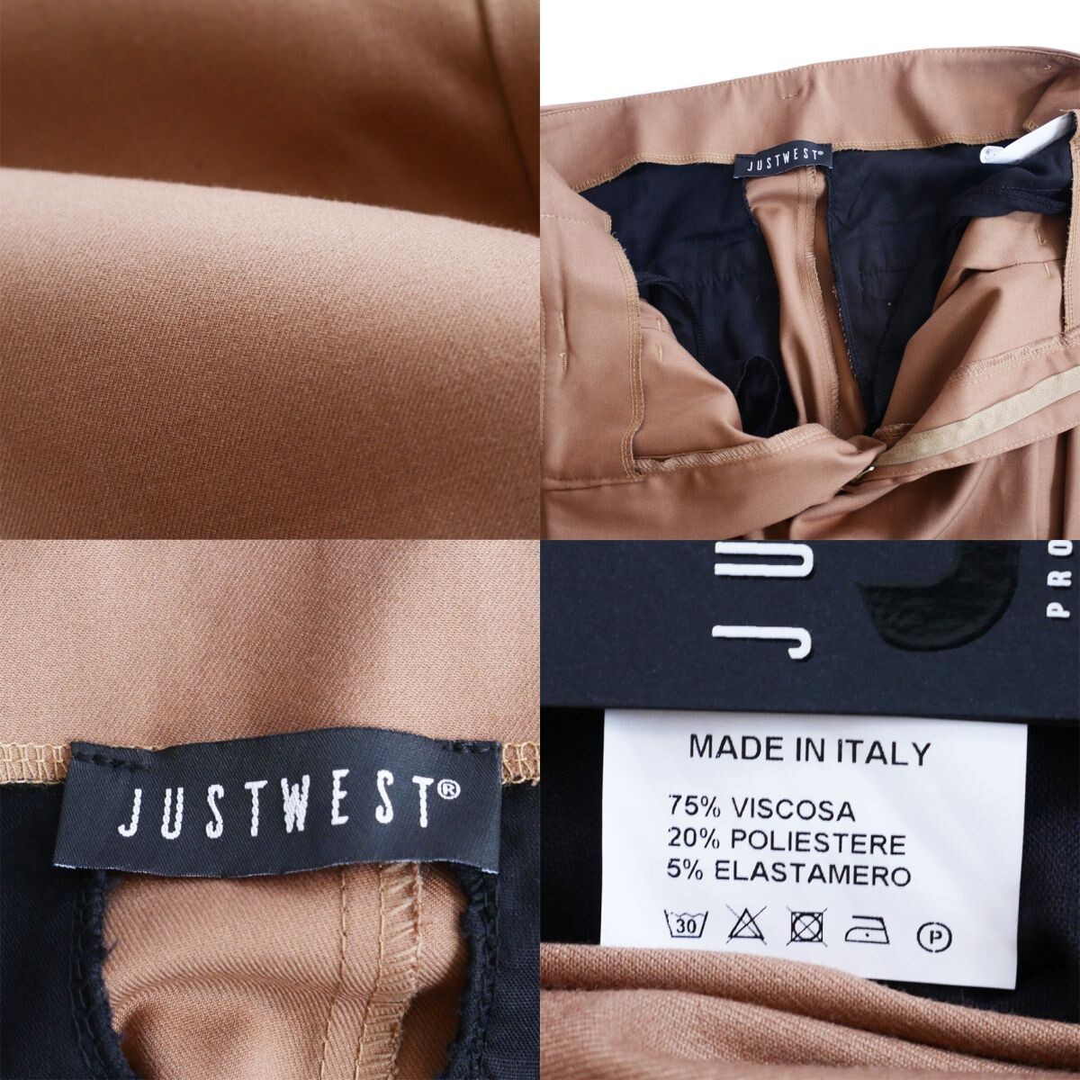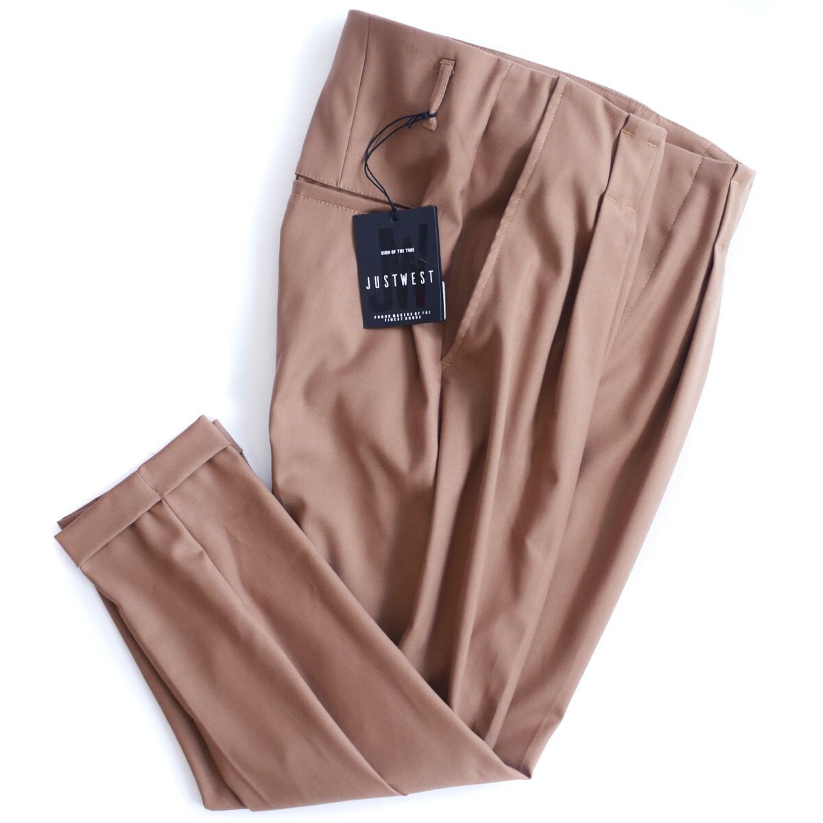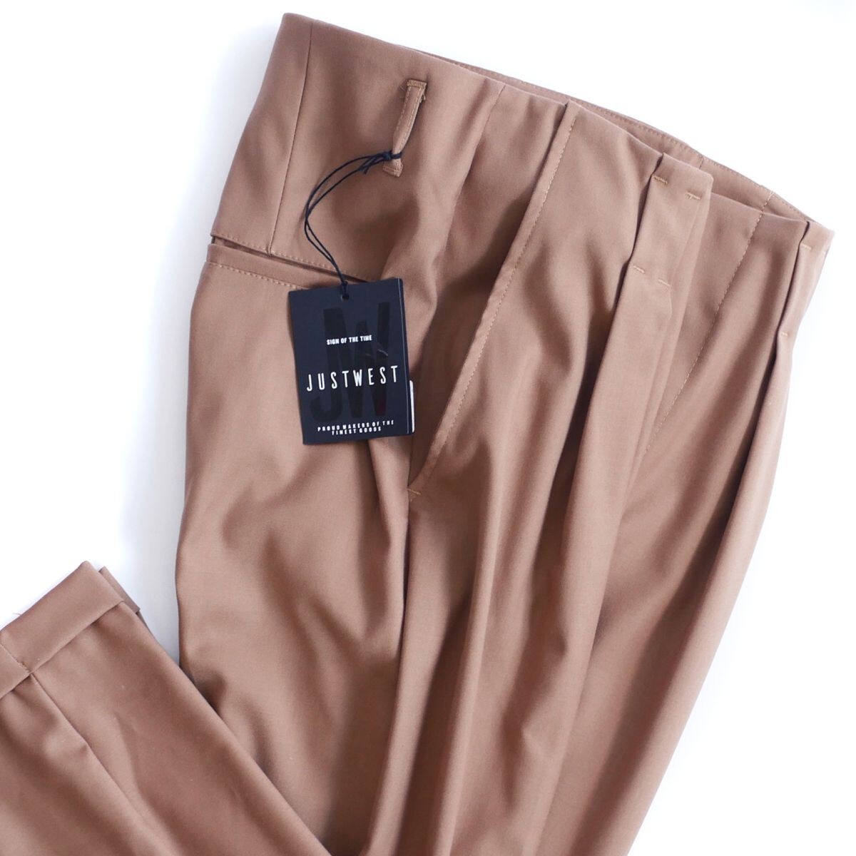 ●イタリア製のラグジュアリー感溢れる一本。こちらは「JUSTWEST(ジャストウェスト)」による、今季2025-2026秋冬コレクションからのタック入りスラックスパンツでございます。オールシーズンご利用いただけそうな生地質です。下に行くにつれて細身になり脚長効果のある美しいシルエットのテーパードパンツは、裾丈直しが入りますと元の裾幅がその分太くなり、全体のシルエットがそこないかねません。当方が提言しております「イタリージー」なスタイルでは、お直しなし・もしくは最小限のお直しのみでご利用いただけるものばかりですので、イタリア製のオリジナルデザインをそのままご体現いただけるので、貴重です。 ●シルエットは現代的な腰周りにゆとりを持たせつつ、裾にかけてテーパードしたバランス感が秀逸で、洗練された都会的スタイルを演出いたします。ジャケットのような存在感のパンツでございます。クラシカルなツープリーツのディテールに、滑らかで程よい光沢感を持つビスコース混ツイル素材を採用し、動きやすさと美しさを兼ね備えた一本となっております。普段ジョルジオアルマーニ他ラグジュアリーブランドのボトムをご愛用されていらっしゃる方も、雰囲気良く着こなしていただけます。またハイブランドにはない、最初からジャストサイズな丈感で、裾幅16-17cm台の美しいシルエットのデザインをそのままご愛用いただけるのも、当方からお勧めするイタリージーなアイテムらしさです。やや短めにとって靴下を見せ気味にする、現代イタリア人の着こなしでご利用いただけます。この美しいスタイルのボトムを、ほとんどの日本人がお直し無しでご利用いただけるのは、貴重なシリーズかと思います。 ●フロントにはツータック仕様を取り入れ、立体感のあるフォルムが特徴。カジュアルな装いはもちろん、ジャケットスタイルとも相性がよく、オン・オフ問わず幅広くご着用いただけます。サイドにはスラッシュポケット、バックには両玉縁ポケットを配し、実用性も兼備。普段ハイブランドなどご利用いただいているエグゼクティブにしか穿きこなせない、優雅さがございます。様々なご体型の方にフィットしつつも、バタ臭さとは無縁のスラックスパンツですので、「スタイリッシュなかっこよさ」をラクラクに手に入れられます。 ●ベルトループを備えたウエストバンドは丁寧なステッチ仕上げとなっており、品格漂う大人のパンツスタイルに仕上がっております。裾はダブル仕上げで、足元にさりげない重厚感を加味。ウエストボタンを排除し、上までジップで止められ、寸断のないすっきりとした腰回りデザインを実現しています。控えめなディテールの中にも、イタリアンメイドならではの上質感が際立ちます。 ●スペアボタンが付属いたしますので、長くご愛用いただける安心仕様となっております。 ●ツータック。前後ポケットあり。伸縮性あり。裾ダブル仕上げ。 ●イタリア製 ●色:キャラメルブラウン系 ●素材:ビスコース75%、ポリエステル20%、エラスタン5% ●サイズ:42 44 46 50 52の中から、お選びいただけます。ワンサイズ小さいサイズをお選びいただくと、ちょうど良いサイズ感になりそうです。*ご落札後、取引連絡よりご希望のサイズをお申し付け下さい(後の変更・交換・キャンセルは一切して頂けません)。ご落札後、24時間以内のご連絡の程お願い申し上げます。*下記詳細サイズもご確認の上、よろしくお願いいたします。 ●詳細サイズ(cm)置いた状態で: 42 *通常44の方向け。日本サイズ概ねS-Mサイズ辺りとなりますが、着用時の伸縮により比較的多くの方に適応頂けそうです。下記詳細サイズもご確認の上、よろしくお願いいたします。 ウエスト約:79-82 わたり幅:約32.5 股上:30 股下:61*裾ダブル仕上げ、約6㎝の折り返し分あり 裾幅:16*左前裾に本人にしかわからない目立たない程度の、微かな色ムラがあります。 44 *通常46の方向け。日本サイズ概ねMサイズ辺りとなりますが、着用時の伸縮により比較的多くの方に適応頂けそうです。下記詳細サイズもご確認の上、よろしくお願いいたします。 ウエスト約:81-84 わたり幅:約34 股上:30 股下:62*裾ダブル仕上げ、約6㎝の折り返し分あり 裾幅:16 46 *通常48の方向け。日本サイズ概ねM-Lサイズ辺りとなりますが、着用時の伸縮により比較的多くの方に適応頂けそうです。下記詳細サイズもご確認の上、よろしくお願いいたします。 ウエスト約:84-87 わたり幅:約36 股上:31 股下:63*裾ダブル仕上げ、約6㎝の折り返し分あり 裾幅:17 50 *通常52の方向け。日本サイズ概ねXLサイズ辺りとなりますが、着用時の伸縮により比較的多くの方に適応頂けそうです。下記詳細サイズもご確認の上、よろしくお願いいたします。 ウエスト約:92-95 わたり幅:約37 股上:31.5 股下:64.5*裾ダブル仕上げ、約6㎝の折り返し分あり 裾幅:17.5 52 *通常54の方向け。日本サイズ概ねXXL-サイズ辺りとなりますが、着用時の伸縮により比較的多くの方に適応頂け