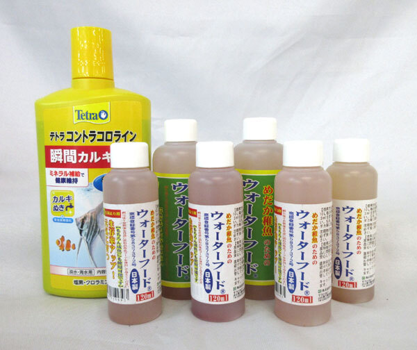 内 容 | ■水槽用品 ・めだかのためのウォーターフード(120ml) 日本製×4点 ・めだか稚魚のためのウォーターフード(200ml) 日本製×2点 ・テトラ コントラコロライン 瞬間カルキぬき 淡水・海水用(500ml)×1点 ※容器に汚れあります |