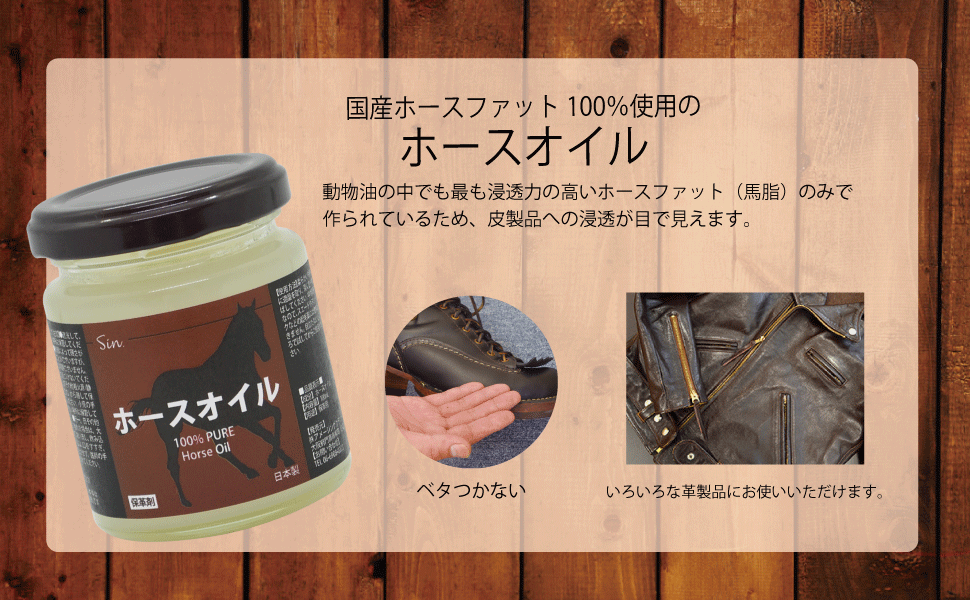 | 説明 | 非常に高い革への浸透力を誇る馬油を原料としたレーザー用オイルです。 ホースオイルをレザー製品に塗り込むことにより、革に潤いを与え、乾燥を防ぎ、酸化、カビや汚れも防ぎます。 馬油の浸透力な抜群のため、自然な風合いに仕上がります。 特に、ヌメ革などのオイルアップを重ねるごとに風合いの出る素材などにおすすめします。 仕上げ剤として非常に優れた天然オイルです。 国産の馬油100%の保革剤 ほぼ無臭で使いやすい 抜群の浸透力で自然な風合いに仕上がります |