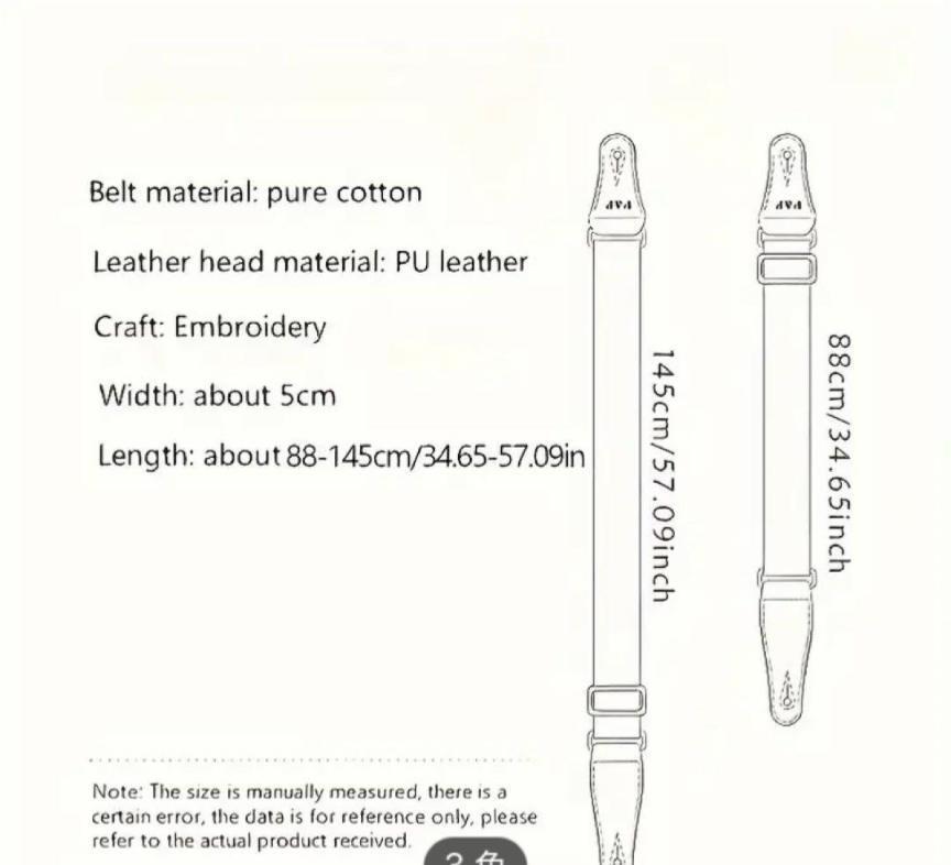 純綿製の刺繍ストラップ、PUレザーのヘッド付きで、幅約5cm、長さ88-145cm調整可能。