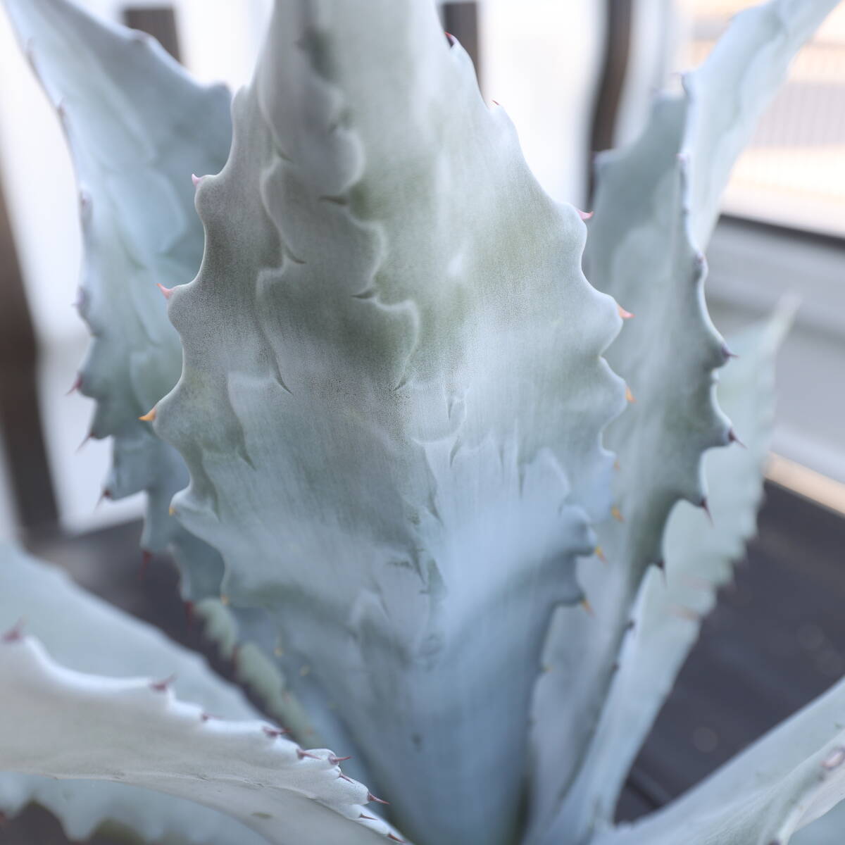 白粉を帯びたサルミアナの葉にコロラータの美しい棘跡模様がプリントされます