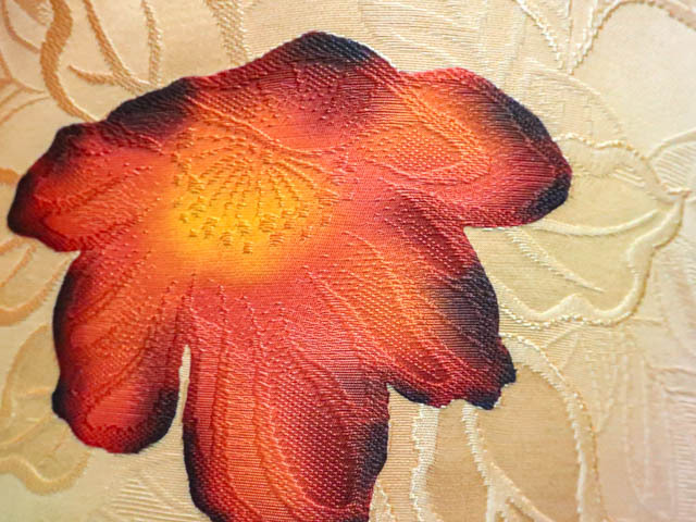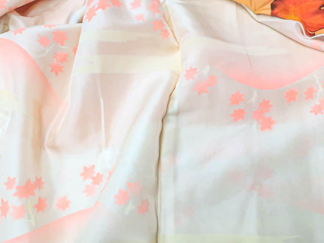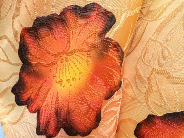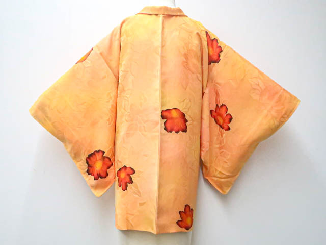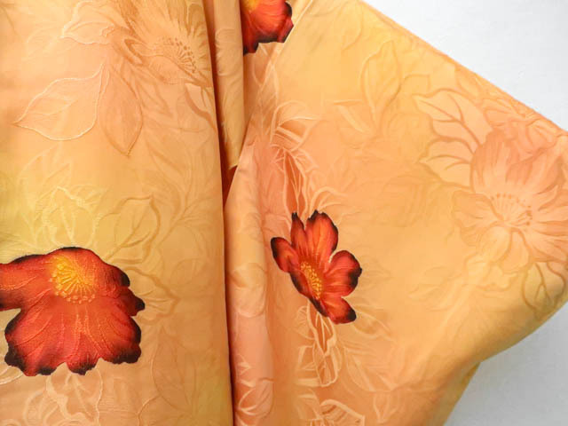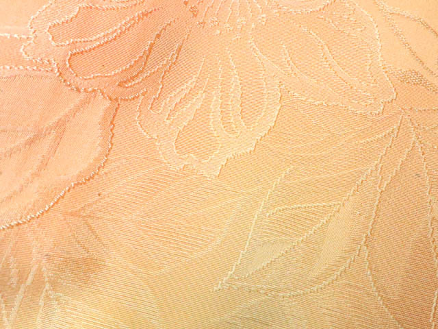 リサイクル商品のため、所々点汚れがございますが着用可能なお品です。 地色は 薄橙です。 1枚目の画像が近いお色かと思われます。 素材は正絹です。 |