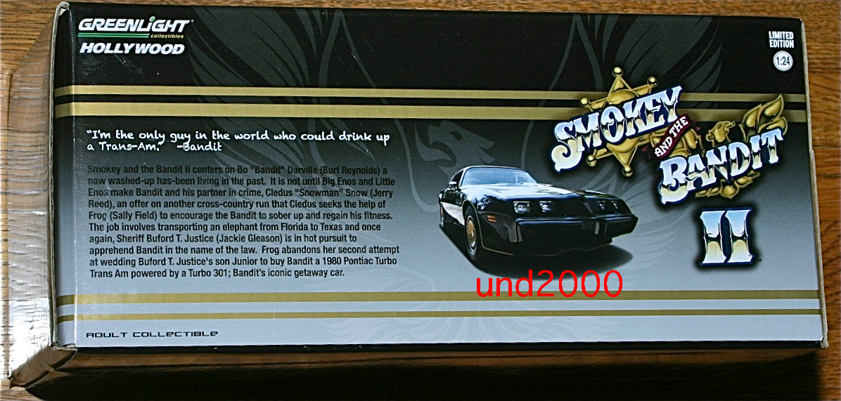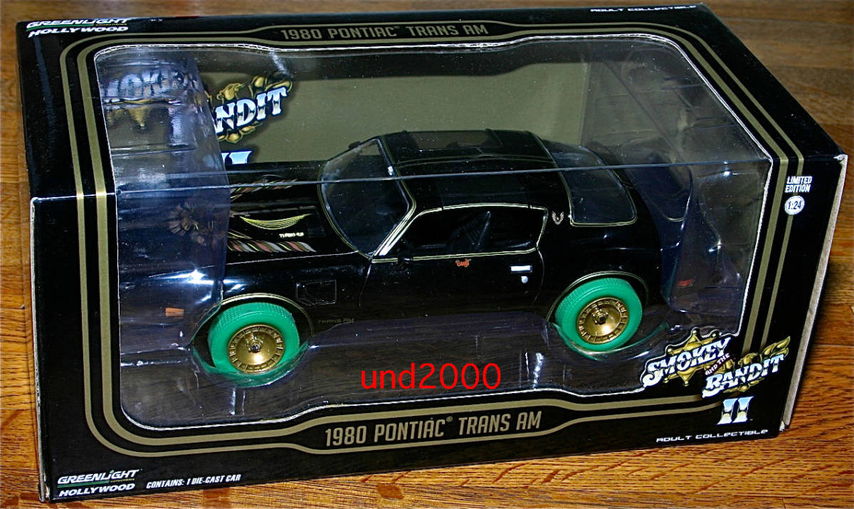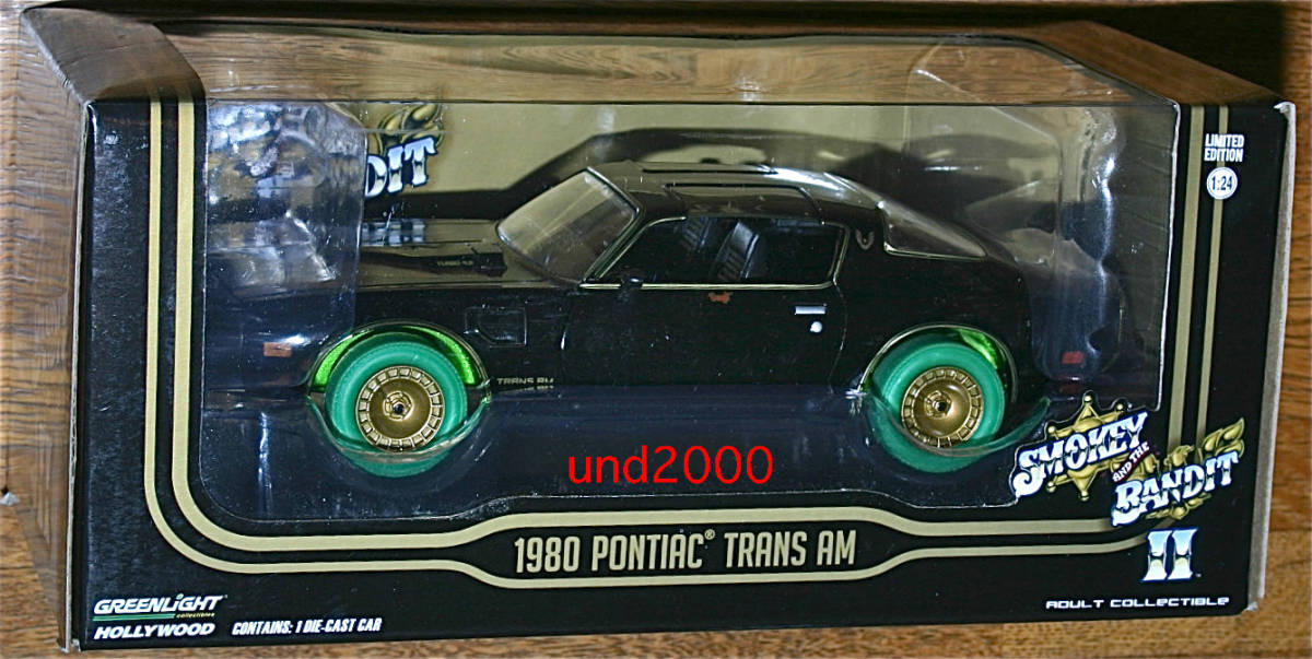 Green Light、Hollywood シリーズ、映画 「トランザム7000 VS 激突パトカー軍団」 Smokey And The Bandit II、1980 Pontiac Trans Am。スケール1/24。タイヤとシャーシがグリーンのグリーンライト版トレジャー・ハント(チェスカー)、グリーン・マシーン。初版。並行輸入品。未使用新品。箱に若干のスレ、弱いへこみがあります。量産品のクオリティ(若干の塗装ムラ、スレ、タンポ印刷ズレやカケ、極小キズ等)に付いては極端に状態の悪いものは別記しますが、ノークレームでお願い致します。お支払いはヤフーかんたん決済のみ。東京発、ゆうパック持込60サイズ(東京700円 - 沖縄1330円)、または定形外郵便 (追跡番号、保険無し) 920円の発送となります。(上記の送料はこの出品物のみの料金となります。複数落札、同梱包発送の場合、重さ、サイズが変わりますので送料が変わります。)3日以内のご連絡、かんたん決済の支払期限内(通常5日、支払方法により異なります)のお支払い厳守でお願いします。入札される前に「自己紹介」もあわせてお読みください。 検索用ワード グリーン・ライト ポンティアック ファイヤーバード ファイアーバード Trans Am Firebird バート・レイノルズ Green Machine Chase チェース チェス