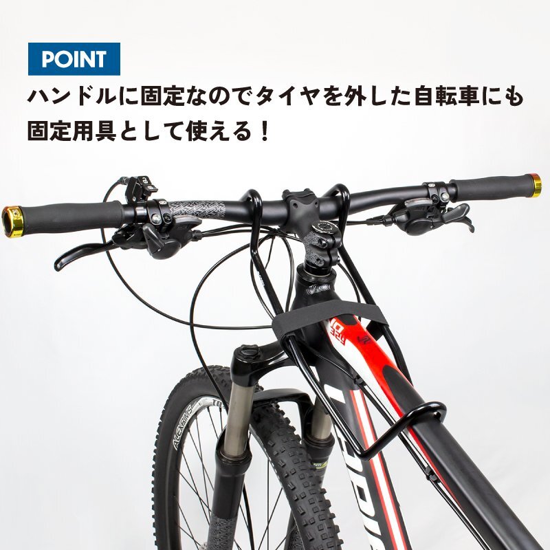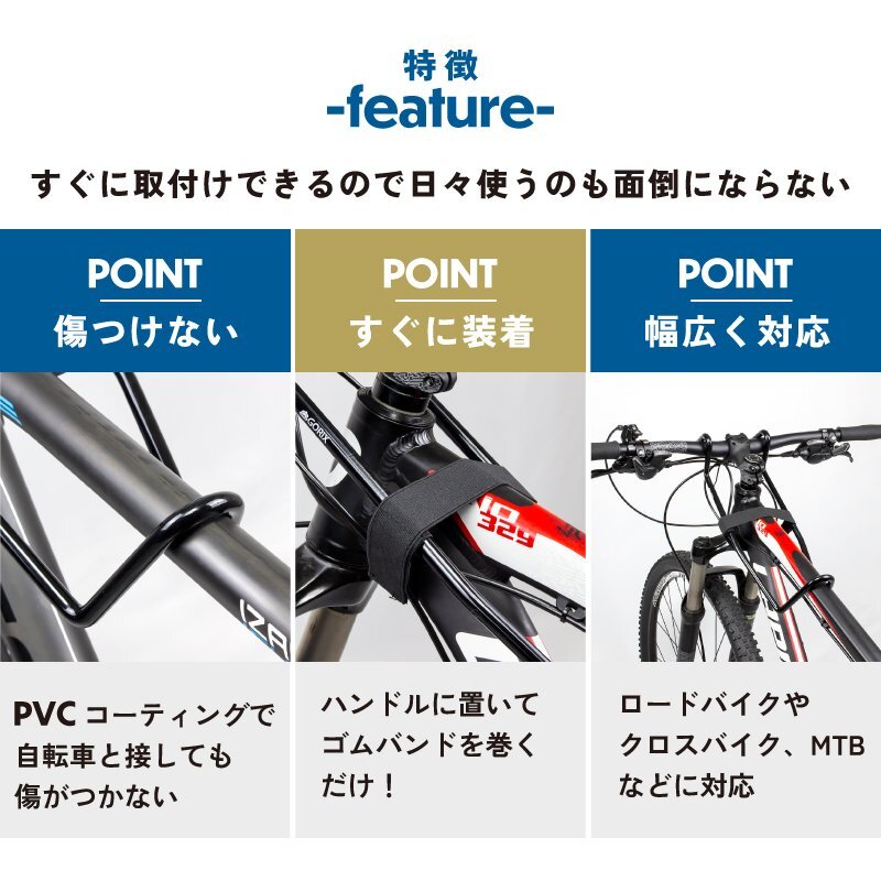 ハンドルと前輪タイヤのぐらつきを防止して真っ直ぐに固定できる便利なハンドルリテーナーです。 前輪がふらふらしないのでメンテナンスや洗車などの作業もストレスなくはかどります。 ハンドルを固定する事で作業性が向上。 後輪固定タイプの自転車スタンドで駐輪の場合にはハンドルが左右に振れてタイヤが壁にこつこつあたって壁を汚してしまう小さいストレスもハンドルを固定する事で解消します。 タイヤを真っ直ぐに出来るので綺麗に駐輪できるのもポイント。 グラつきによるストレスが減り快適に。またタイヤを外した自転車を固定するのに便利です。 装着もうすぐにできて様々なタイプの自転車に対応するので持っておいたら重宝します。 日々使うのも面倒にならない。 [傷つけない] 自転車と接する外側はPVCコーティングでハンドルやトップチューブを傷つけない。 また内側は炭素鋼素材なので強く頑丈で折れたり割れたりしない。 [ゴムバンドでロック] ゴムバンドで自転車とハンドルリテナーを固定します。 ゴムバンドは前後にスライド可能で自転車に合わせて調整できる。 [用途] メンテナンスや修理、整備や自転車保管、輸送時、自転車駐輪のサポートに。 ハンドルやフロント回りが動かない用に固定できる。 [適用自転車] ハンドル径最大径32mm、トップチューブ最大径50mmに対応。 だいたいの自転車にお使い頂けます。 商品内容ハンドルリテーナー サイズ長さ380x幅110/160mm、外径φ9mm 重量約350g 材質炭素鋼本体(径φ6mm)、表面PVCコーティング(厚み約3mm) 適用車種ハンドル径最大φ32mmやトップチューブ最大φ50mmにも対応し、ほとんどのロードバイクとMTBに使用可能です。 ・ディスプレイ環境により実物と色が異なる場合が有ります。 ・入荷時期により予告無く一部仕様変更する場合が有ります。 ・表記サイズは商品の伸びの無い寸法計測数値です。 |