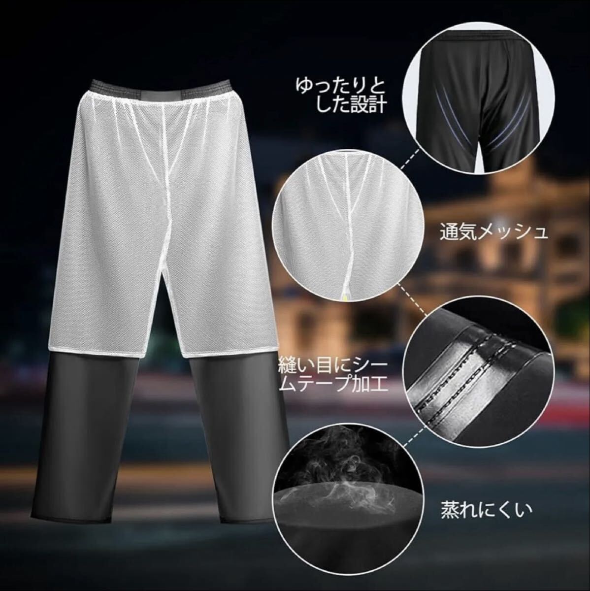【メッシュ付】裏地にメッシュ素材を採用、硬いコーティング生地ウェアと肌が直接触れ合うことを避けられます。肌にやさしく長時間着用に適しています。メッシュ加工で通気性・透湿性が一層に向上、蒸れにくく快適なレインコートです。※着脱のしやすさを考慮し、パンツの半分しかメッシュ付きません。