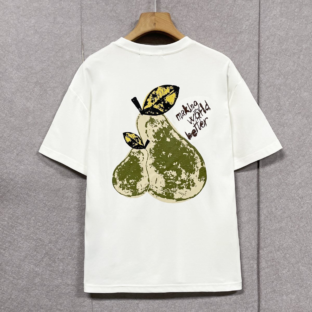 派手すぎず、上品に着こなせる、スタイリッシュなシャツです。ゆったりとしたオーバーサイズが大人のリラックスムードを漂わせます。前後に洋ナシ柄と英字柄デザインがお洒落度をアップ!シンプルのラインとクラシッククルーネックデザインを採用して、何にでもコーディネートやすい1着となっております。