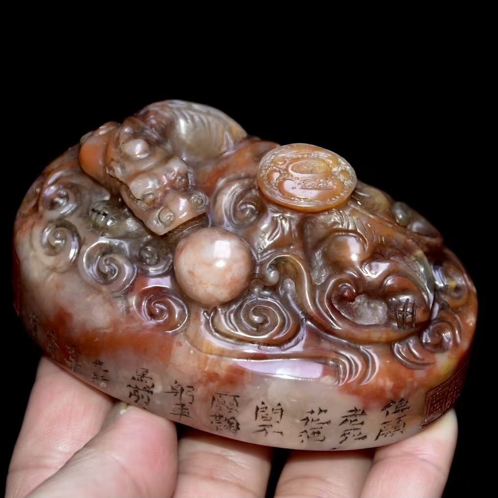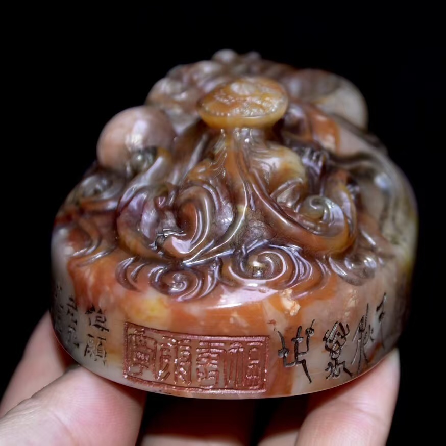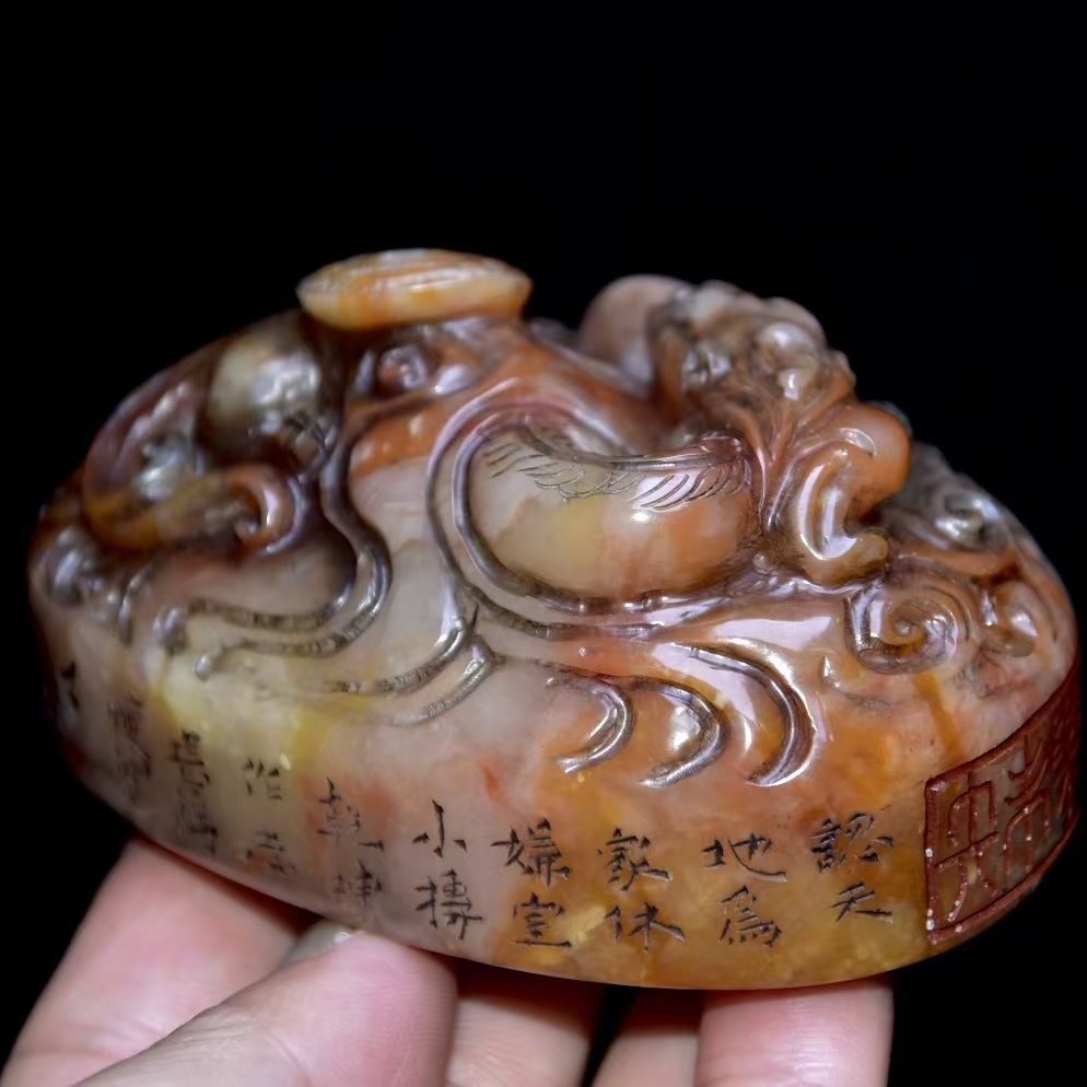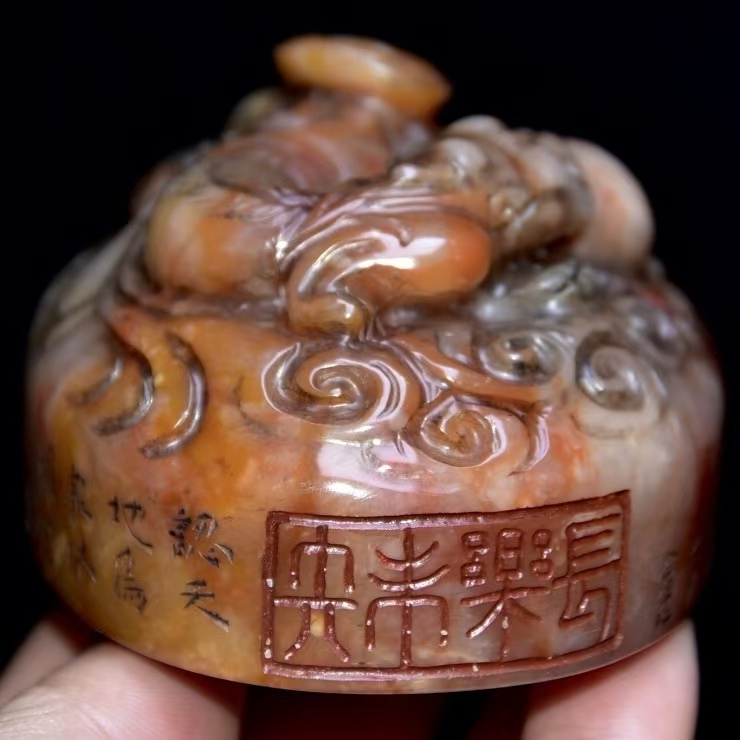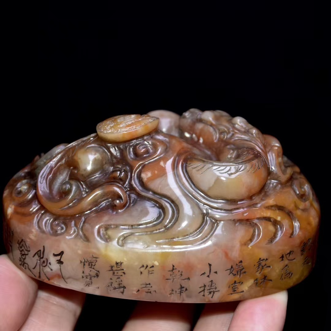 唐物 旧家蔵出 清時代 老寿山石 芙蓉石 神龍 印章 印鑑 天然石 文房具 書道具 古印材 古玉彫 極細工 箱有 古置物 古董品 時代物 古美術111