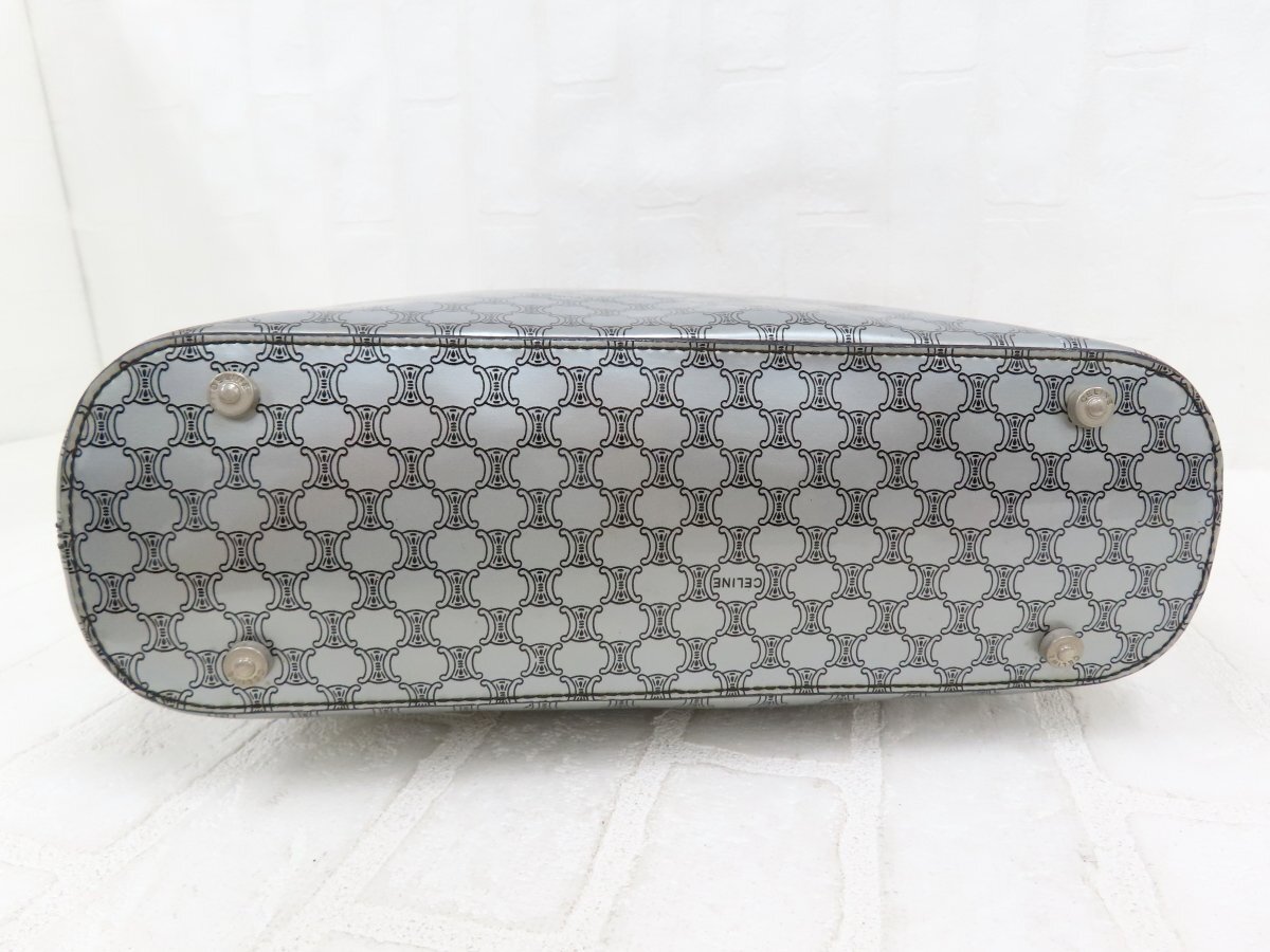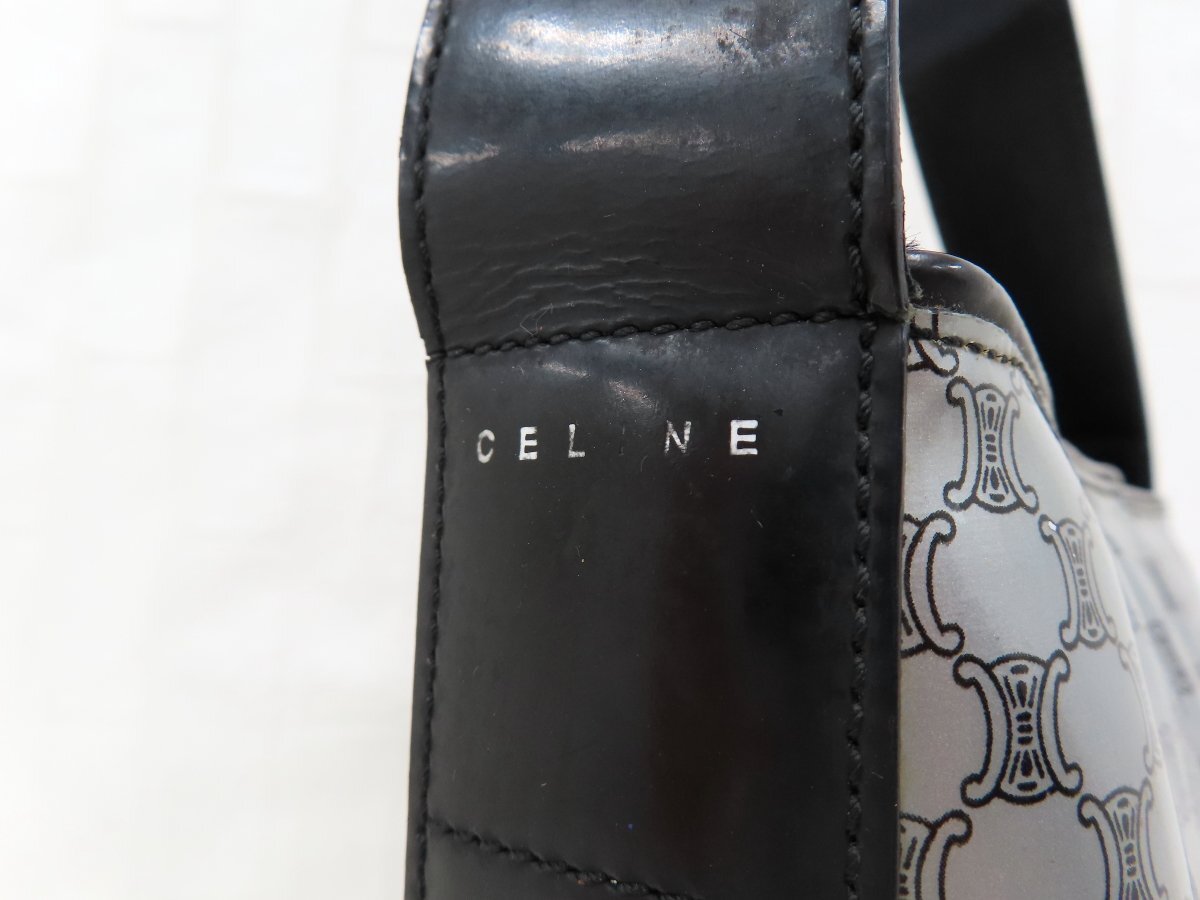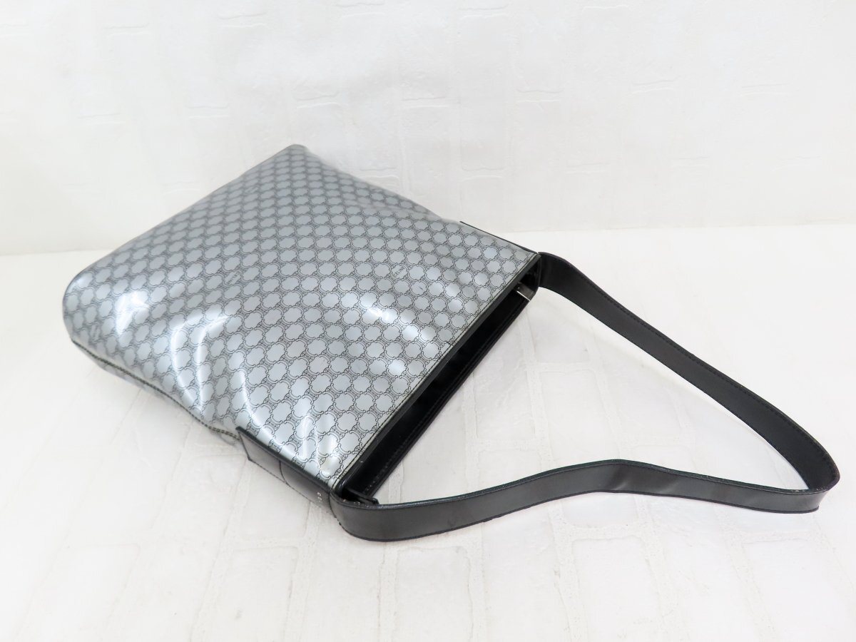 美品◆CELINE セリーヌ◆マカダム◆エナメル パテント カーフ レザー 本革◆ワン ショルダー バッグ◆メタリックグレー 黒 SV金具◆A13754