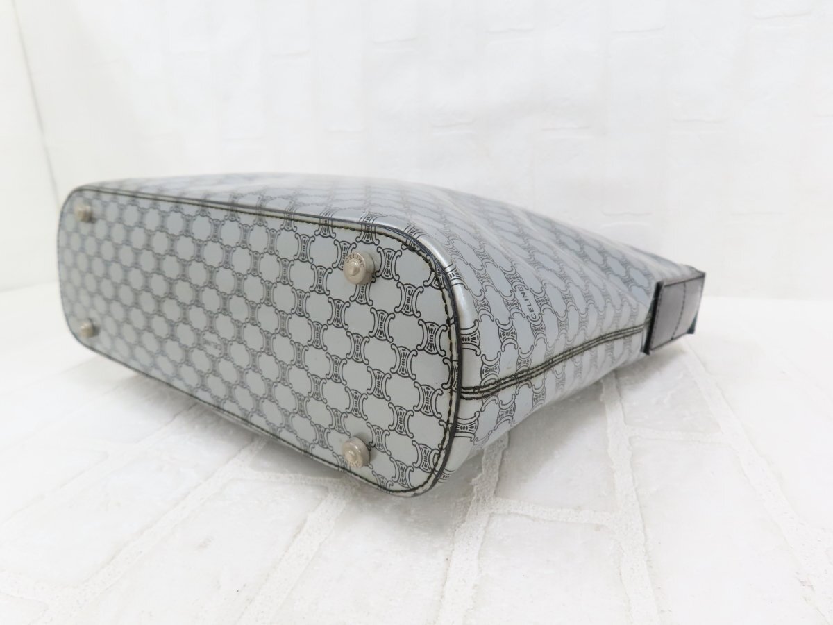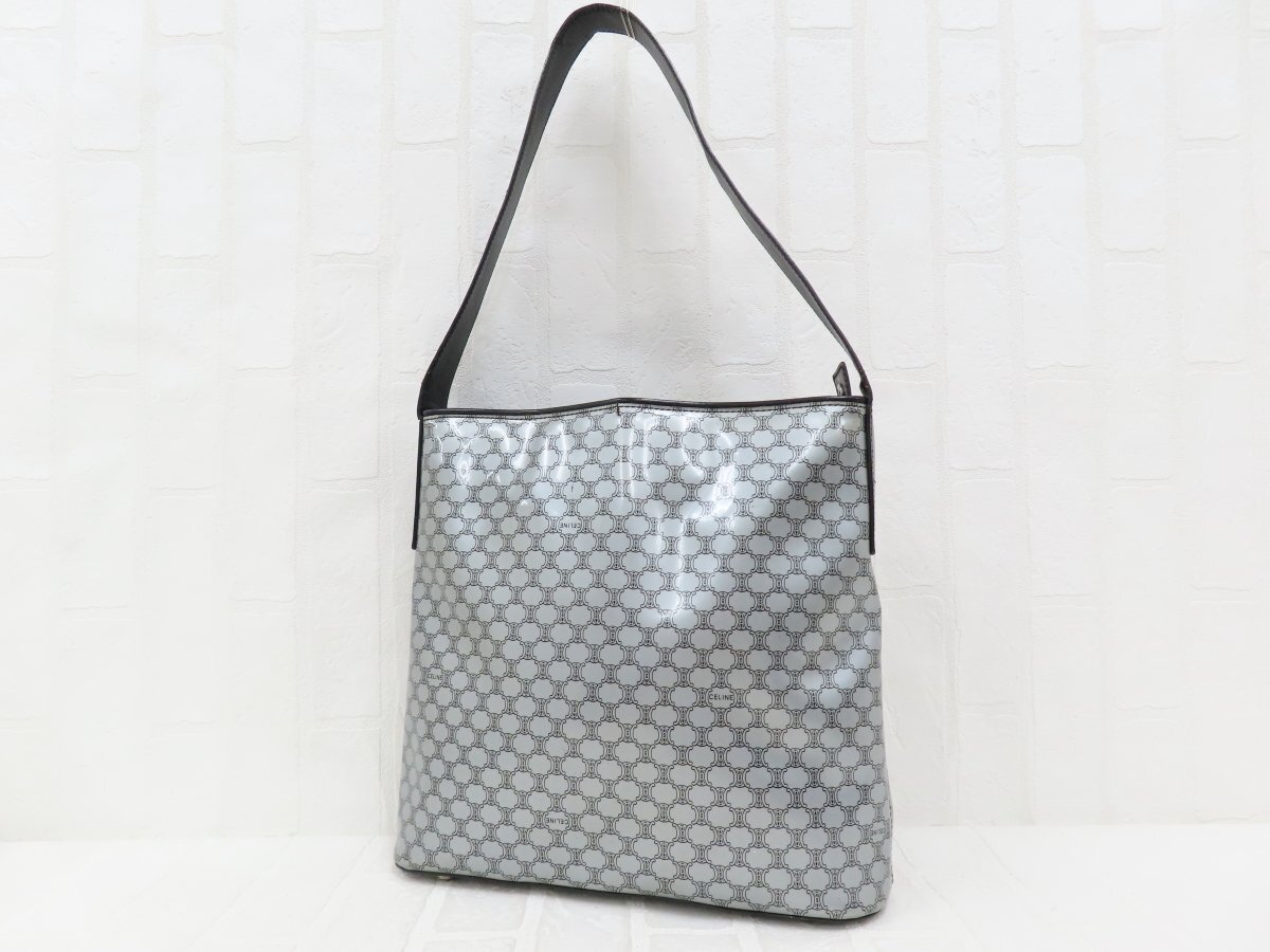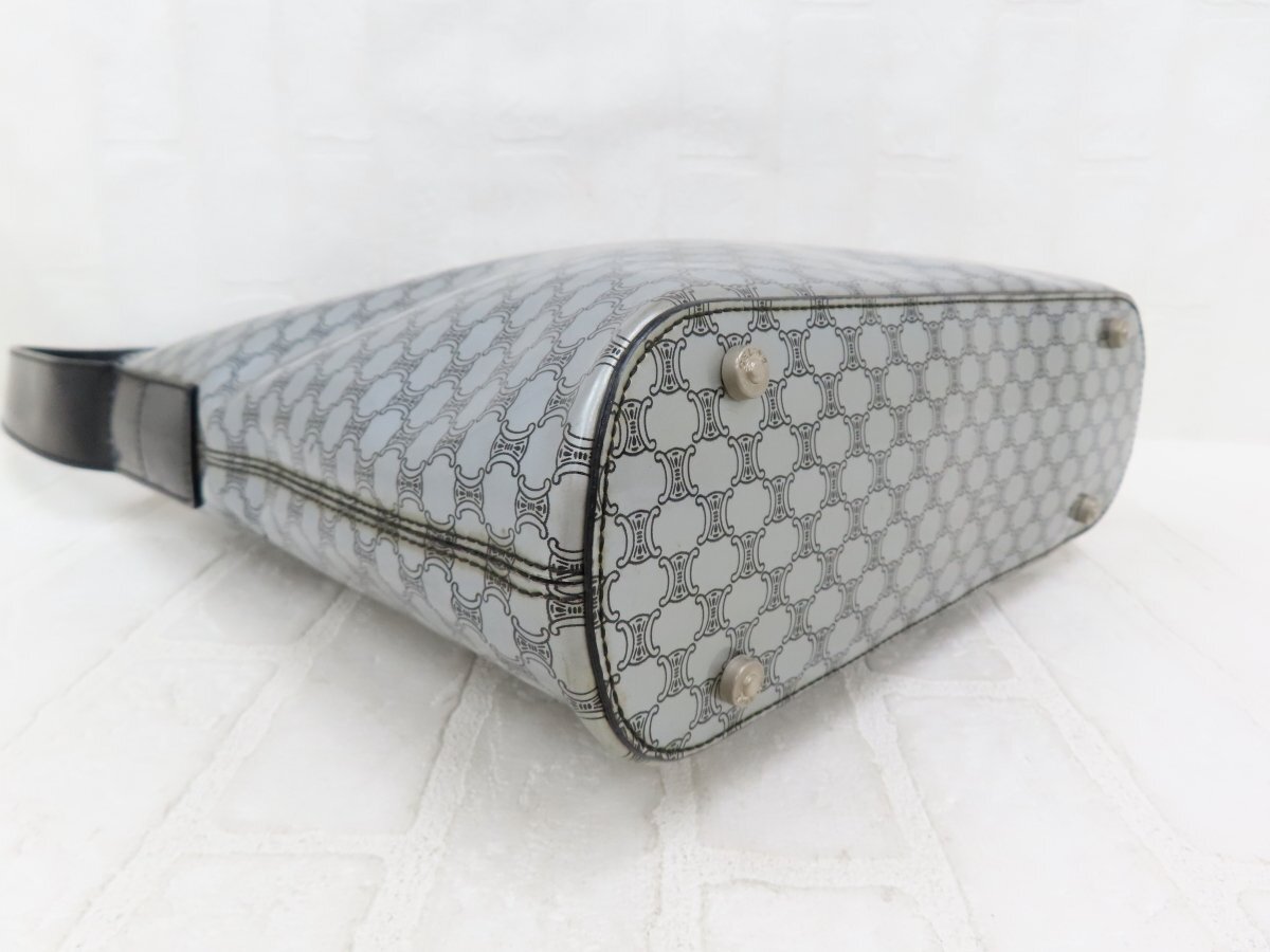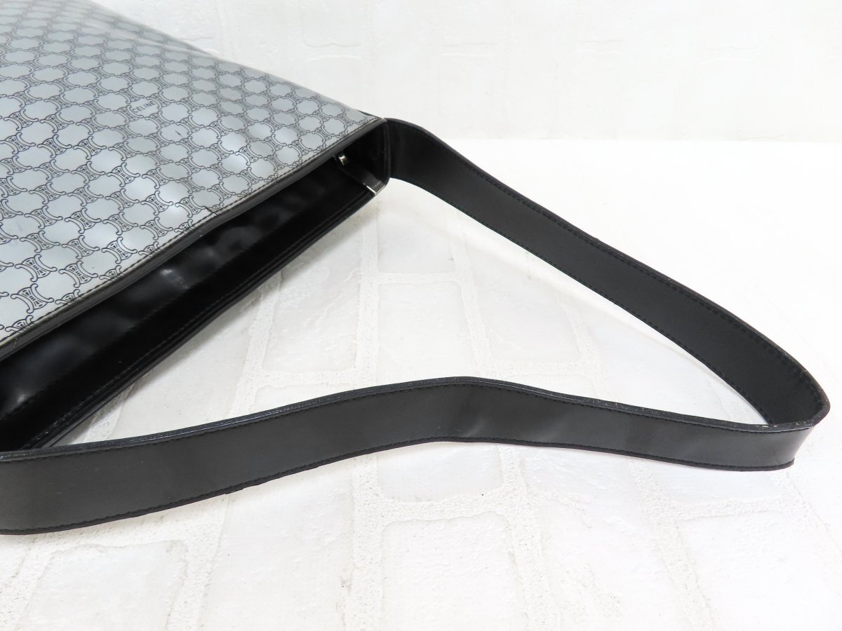 美品◆CELINE セリーヌ◆マカダム◆エナメル パテント カーフ レザー 本革◆ワン ショルダー バッグ◆メタリックグレー 黒 SV金具◆A13754