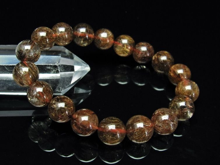 ■商品名: 金針ルチル水晶ブレスレット ■商品ID: T15-10328 ■商品重量:約 37.2g ■商品サイズ:内周約:166mm(±5mm)粒直径約:11mm(±0.5mm)~12mm(±0.5mm) 【ルチルクォーツ(針入水晶)】 ルチルクォーツは近年大人気の針状物質が入った水晶です。繊細な針が水晶の中でひしめきあい、きらきらと輝く様はまさに自然の芸術品。 様々な色のタイプがありますが、共通する効果としては財運や金運を強力に集め、事業運、商売運、目標達成、直観力をもパワーアップさせると言います。また邪気を払ってくれるとされています。 財に関わる直観力が冴えるとされますので、投資やギャンブル運アップも期待できます。 ■ワンポイント情報 一般にクリアでかつ金針が密集しているもの程価値があるとされていますが、内包物を含む水晶は濁ったように結晶しやすく、ルチルクォーツは針が多くなるとどうしても透明感は下がってきます。しかしながら天然石は世界に一つしかありません。いろいろ状態のルチルがありますので直感で閃いたものが、世界で一人の自分のための水晶といえるでしょう。 気の遠くなるような年月をかけ育つ水晶の中に、偶然に針状物質が入り込む。この奇跡のような自然の神秘に是非触れてみて下さい。体の底からパワーが湧き出してくるはずです。 【水晶(石英、クリスタルクォーツ)】 水晶とは石英を指しますが、一般的に無色透明のものをクリアクォーツやロッククリスタルと呼んでいます。 水のように美しく透き通ったものが良いと思われがちですが、内部にヒビや他の鉱物などのインクルージョン(内包物)が入っているものがあり、それが天然物の証。また、インクルージョンによって様々な種類に分類され、それぞれ違った印象を与えてくれます。 古くから呪い事に使われてきた水晶に秘められたパワーはとても万能で、あらゆる場面に対応するといわれています。特に邪気を祓う力が強いため、人間関係を円滑にしたり、心身をクリアな状態にしたい場合に最適です。また空間を浄化する作用もあるとされ、インテリアとしても高い人気を誇っています。 石自体に強い自浄作用があり、他のパワーストーンが吸収した負のエネルギーを浄化するといわれています。更にアクセサリーとして他の石と組み合わせる場合、それぞれの石の個性を引き出しバランスを取ってくれる効果があるそうなので、ぜひとも組み込んでおきたいですね。 パワーストーン入門に最適な水晶ですが、愛好家にとってはかなり奥が深く最後に行き着くのもこの石なんだそうです。何もかもを見透かすような透明な水晶には、本当に神秘的なパワーが宿っているのかもしれません。 |