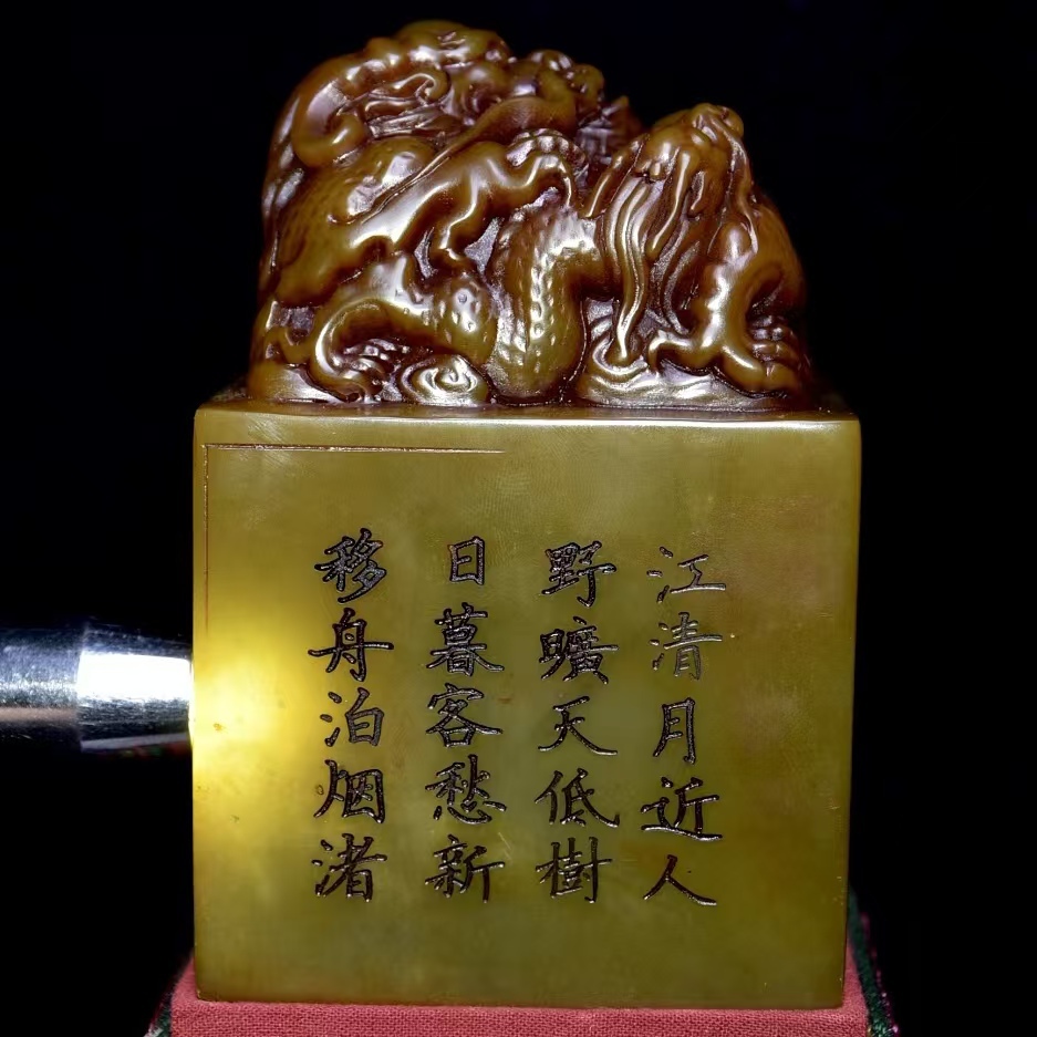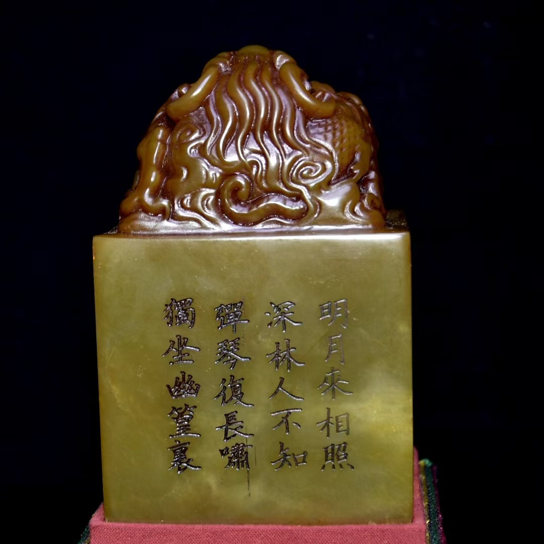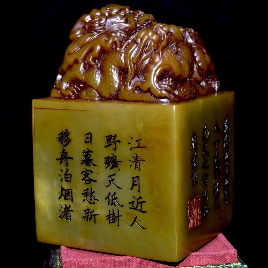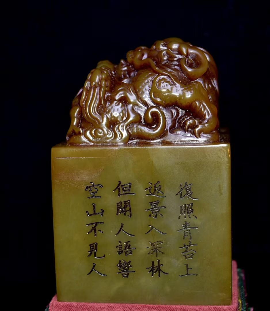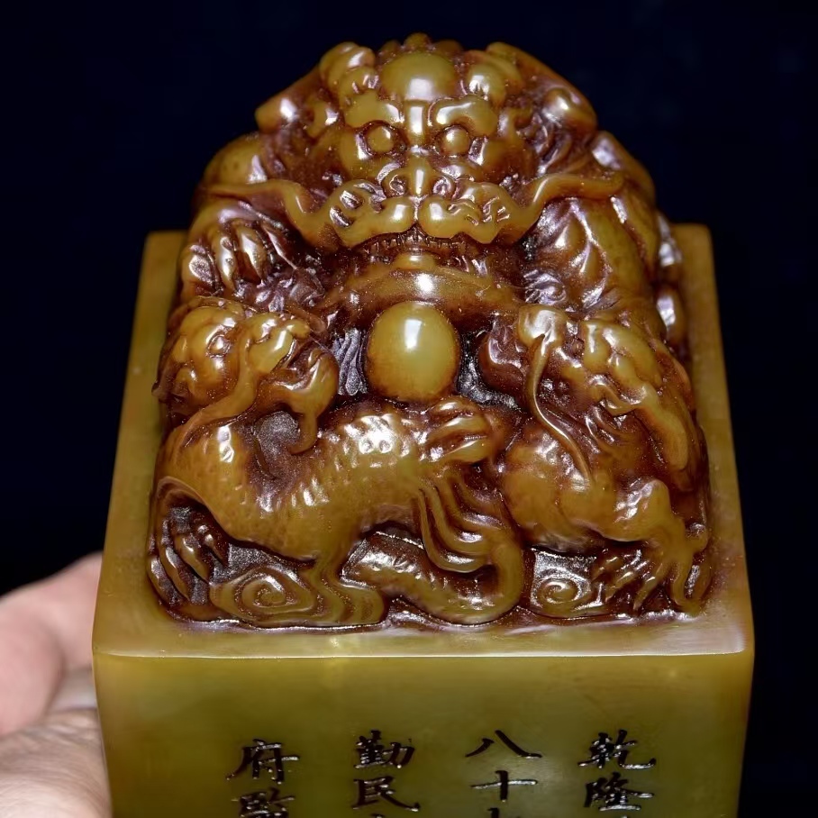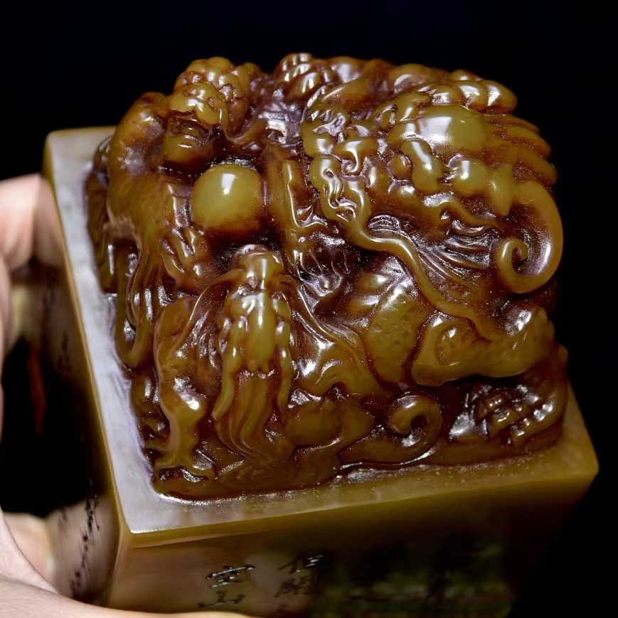 唐物 旧家蔵出 清時代 寿山石 田黄石 古龍玉璽印章 印鑑 天然石 文房具 書道具 古印材 古玉彫 極細工 箱有 古置物 古董品 時代物 古美術111
