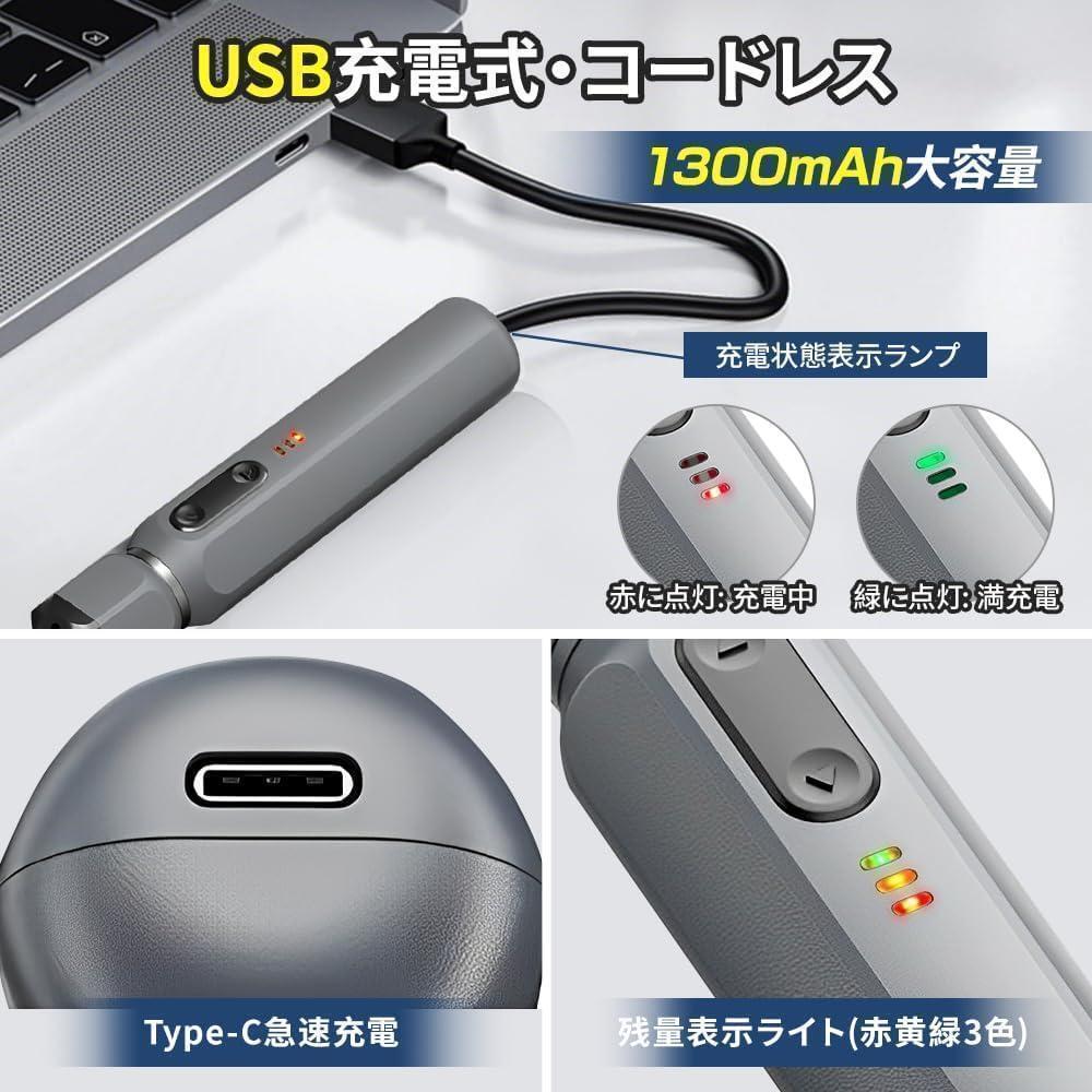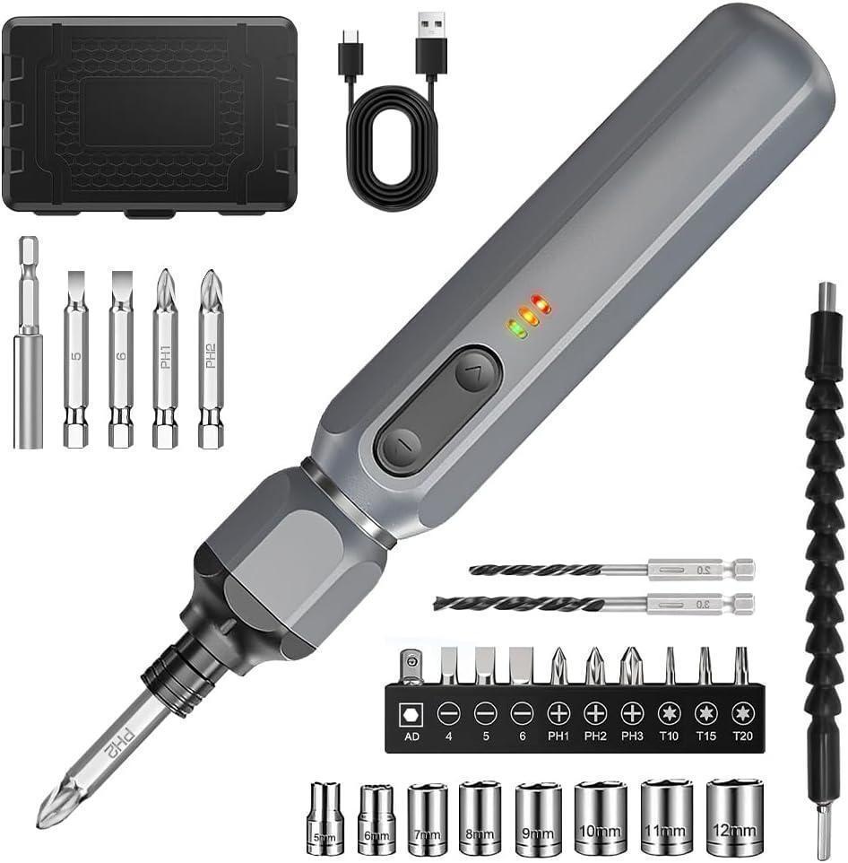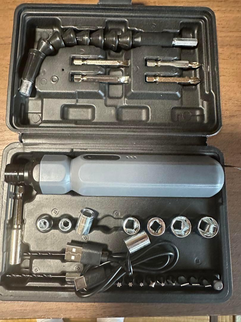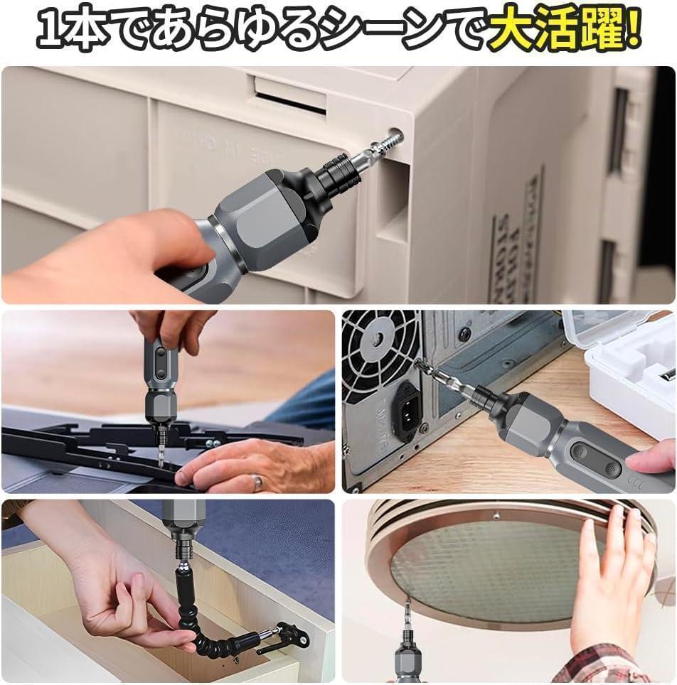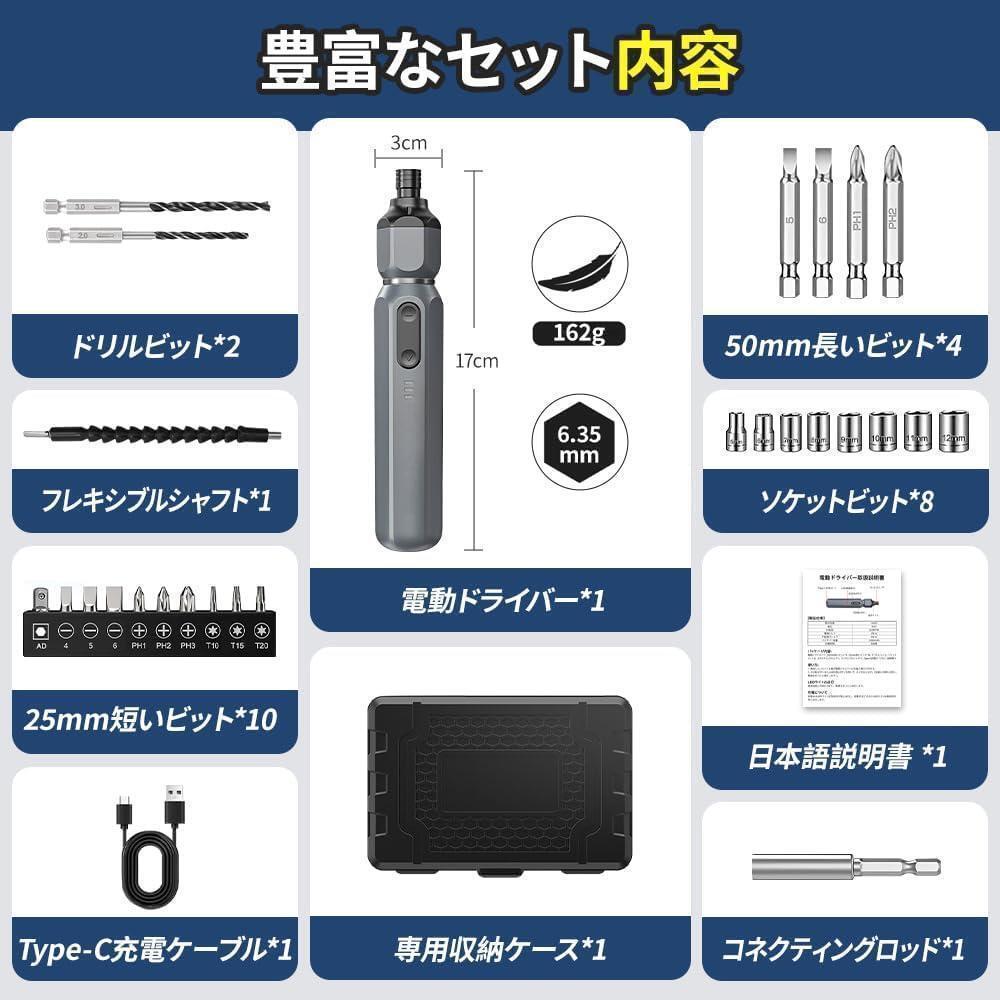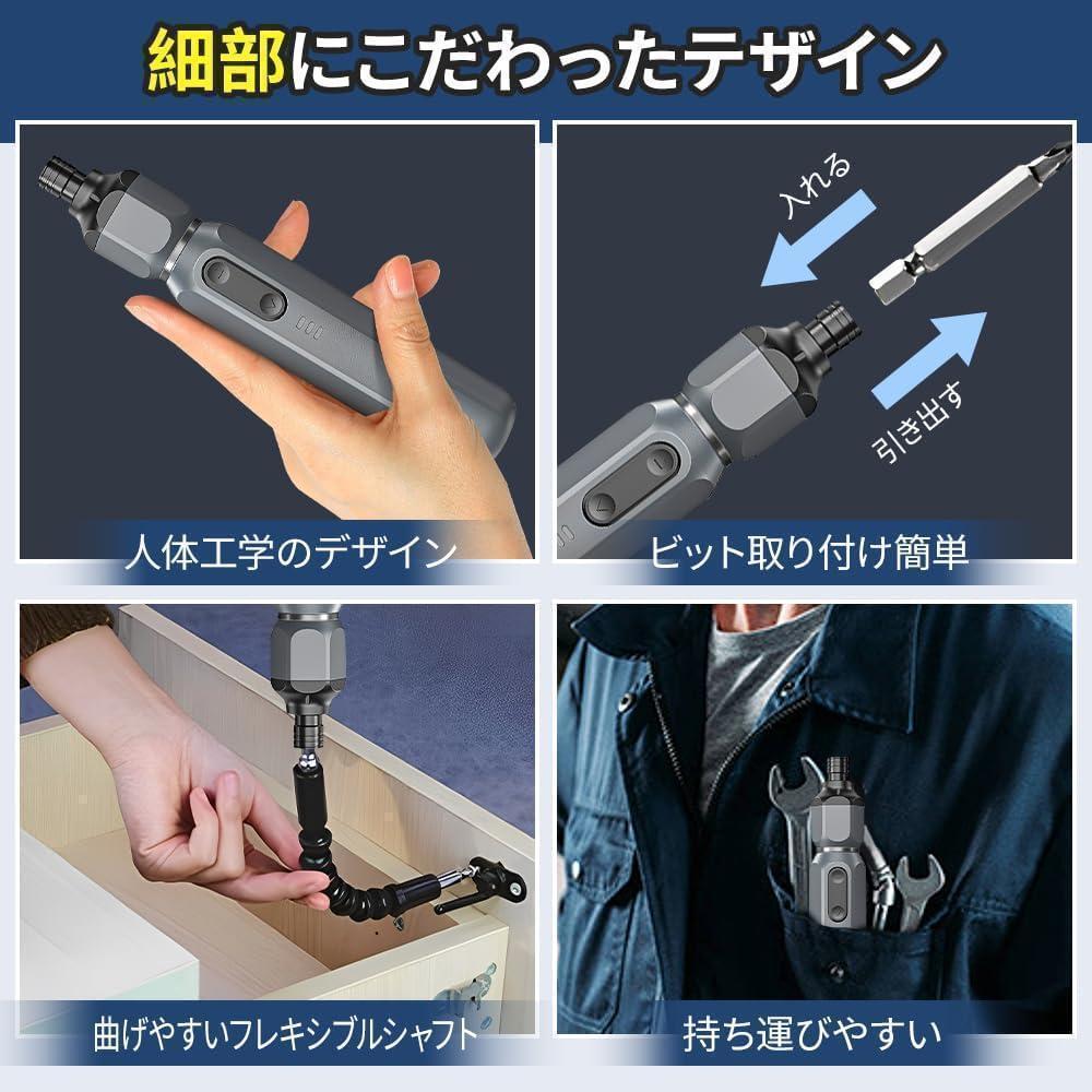 【豊富なアクセサリー】24種類の異なるビットと1本フレキシブルシャフトと1本60mmコネクティングロッドがあり、さまざまなニーズを満たすために家庭で必要なツールセットです。付属のフレキシブルシャフトは、狭いスペースのネジの取り付けと取り外すことはできます。▲付属品:本体*1、50mm長いビット*4、25mm短いビット*10、ドリルビット*2、ソケットビット*8、コネクティングロッド*1、フレキシブルシャフト*1、Type-C充電ケーブル*1、取扱説明書*1。