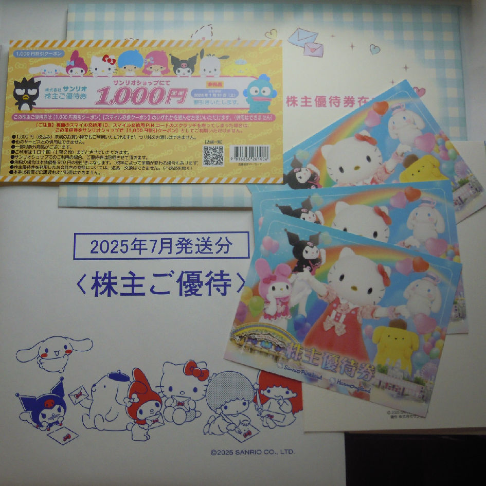 ・「サンリオ株主優待券3枚+1,000円割引券+アクリルスタンド 有効期限2026年1月31日 送料込」の出品です。