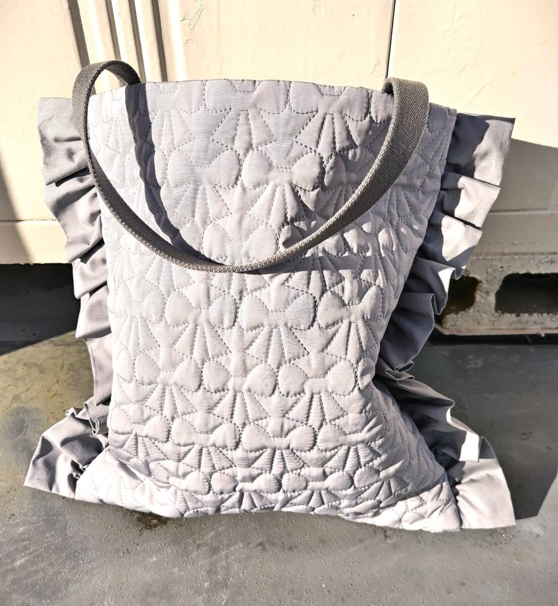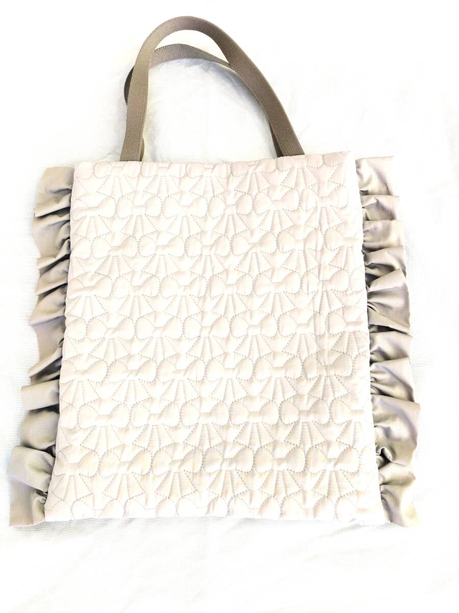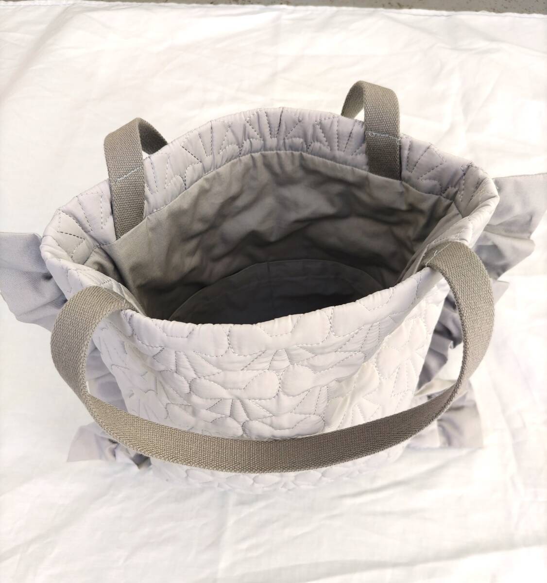フリルデザインのグレーの手提げバッグ、裏地付きで実用的。